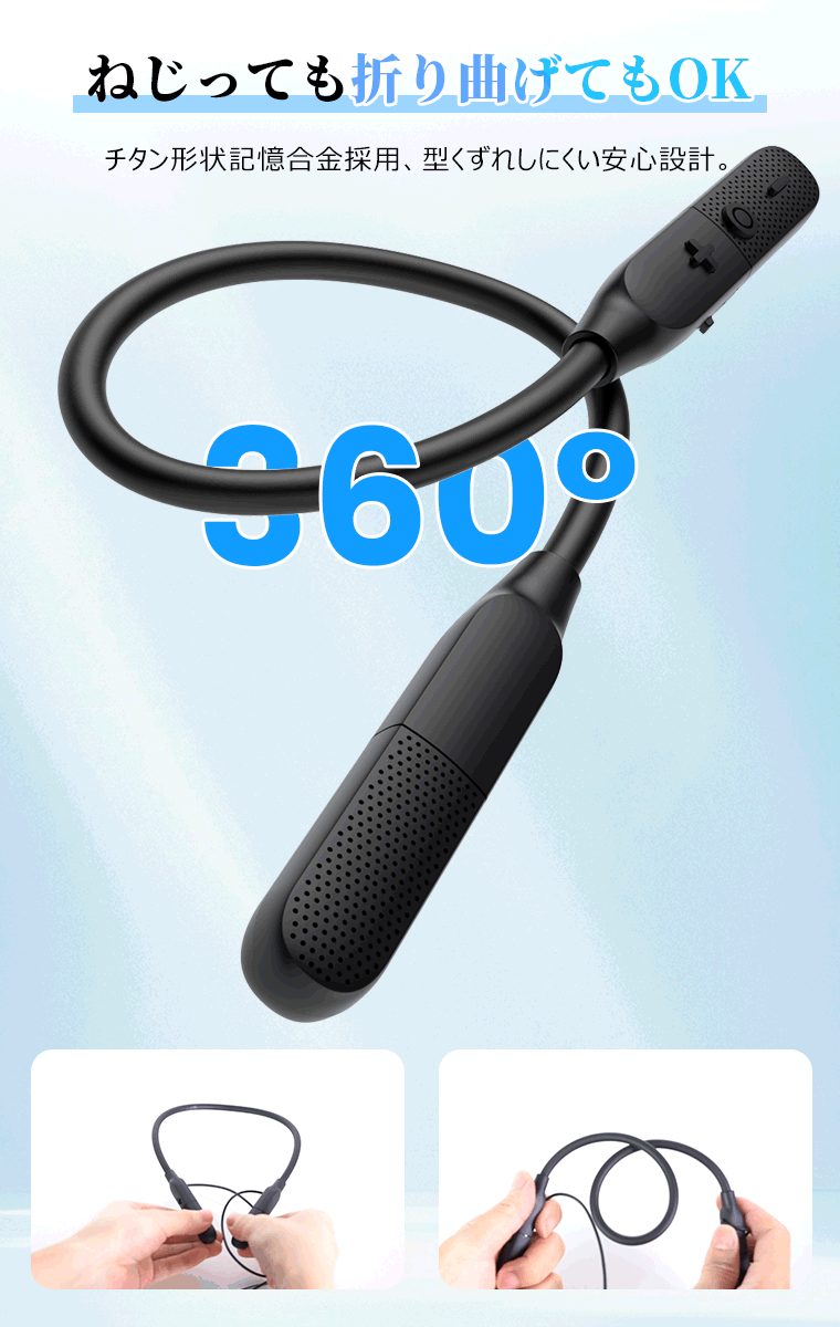 チタン形状記憶合金ネックバンドを採用し、360°のねじりや折り曲げにも対応。