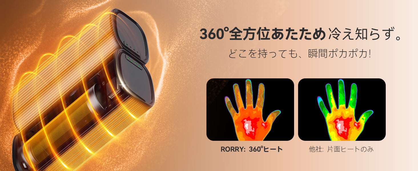 360°からじんわり広がる熱が、掌から指先までしっかり温め、外出先でも室内でも両手同時のぬくもりを体感できます。