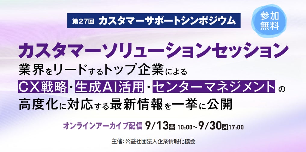バーチャレクスグループのバーチャレクス・コンサルティング株式会社(本社:東京都港区、代表取締役社長:丸山勇人、以下、バーチャレクス)は、公益社団法人 企業情報化協会(IT協会)主催の第27回カスタマーサポートシンポジウムに協賛し、オンライン配信される「カスタマーソリューションセッション」にて講演を行います。バーチャレクスは、「生成AIの顧客フロント活用による次世代型コンタクトセンターの構築」と題して講演予定となっており、その模様は2024年9月13日(金)10:00から9月30日(月)17:00までオンラインアーカイブ配信にてご視聴頂けます。