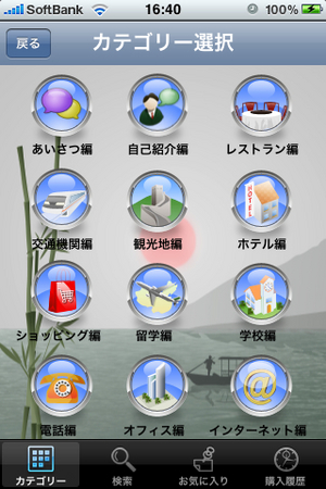 あいさつ編・自己紹介編・レストラン編・交通機関編・観光地編・ホテル編・