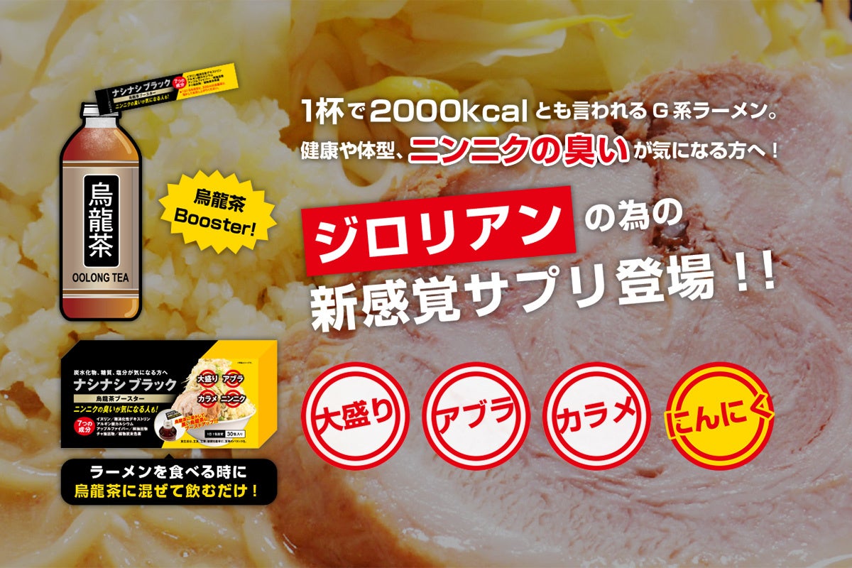 「宅麺.com」がクロスセルでラーメン店の収益拡大とリスク分散をサポート。ジロリアンの為の新感覚サプリメント「ナシナシ ブラック」新発売!