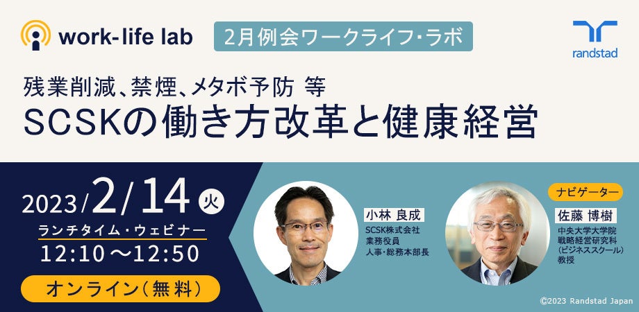 総合人材サービスを提供するランスタッド株式会社(本社:東京都千代田区 代表取締役会長兼CEO ポール・デュプイ)は、2月14日(火)に無料ウェビナー「残業削減、禁煙、メタボ予防等 SCSKの働き方改革と健康経営」を開催いたします。新時代のワークライフを研究する「ワークライフ・ラボ」の第7回として開催するもので、SCSK株式会社の人事・総務本部長である小林 良成氏をゲストに迎え、中央大学大学院 戦略経営研究科 教授の佐藤 博樹氏がナビゲーターを務め、働き方改革と健康経営のヒントについて対談します。