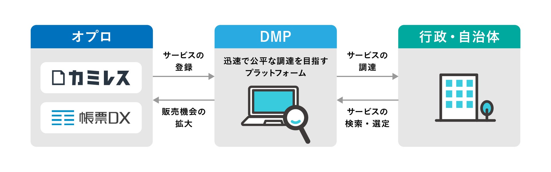 DMPは、デジタル庁が運営するクラウドサービス等の調達支援プラットフォームです。このたびの登録により、オプロの「カミレス」と「帳票DX」は、全国の行政機関に向けた信頼性の高いサービスとして公式に認知されるとともに、DMPを通じて検索・選択・調達が可能となります。