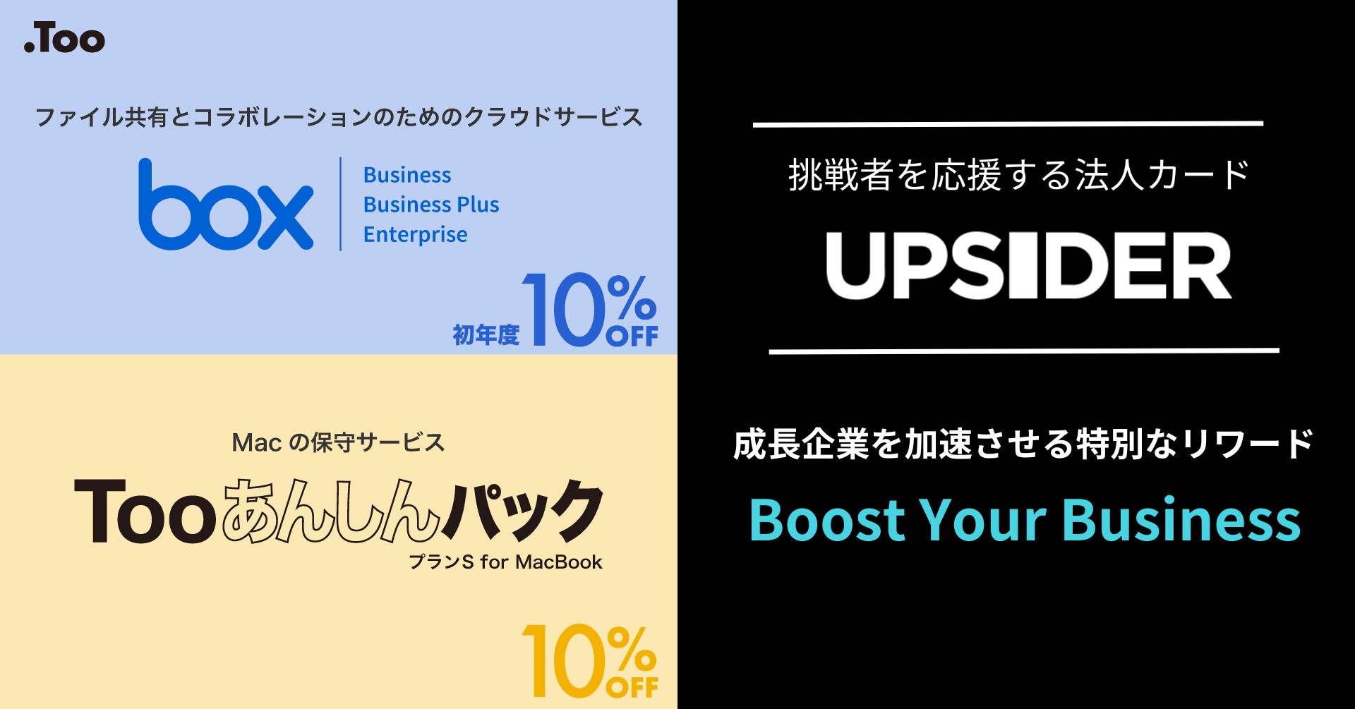 今回の優待プログラムの提供により、法人カード「UPSIDER」を利用する企業の方はファイル共有とコラボレーションのためのクラウドサービス「Box Business/Box Business Plus/Box Enterprise」を初年度10%割引で、Macの保守サービス「TooあんしんパックプランS for MacBook」を10%割引でご利用いただくことができます。