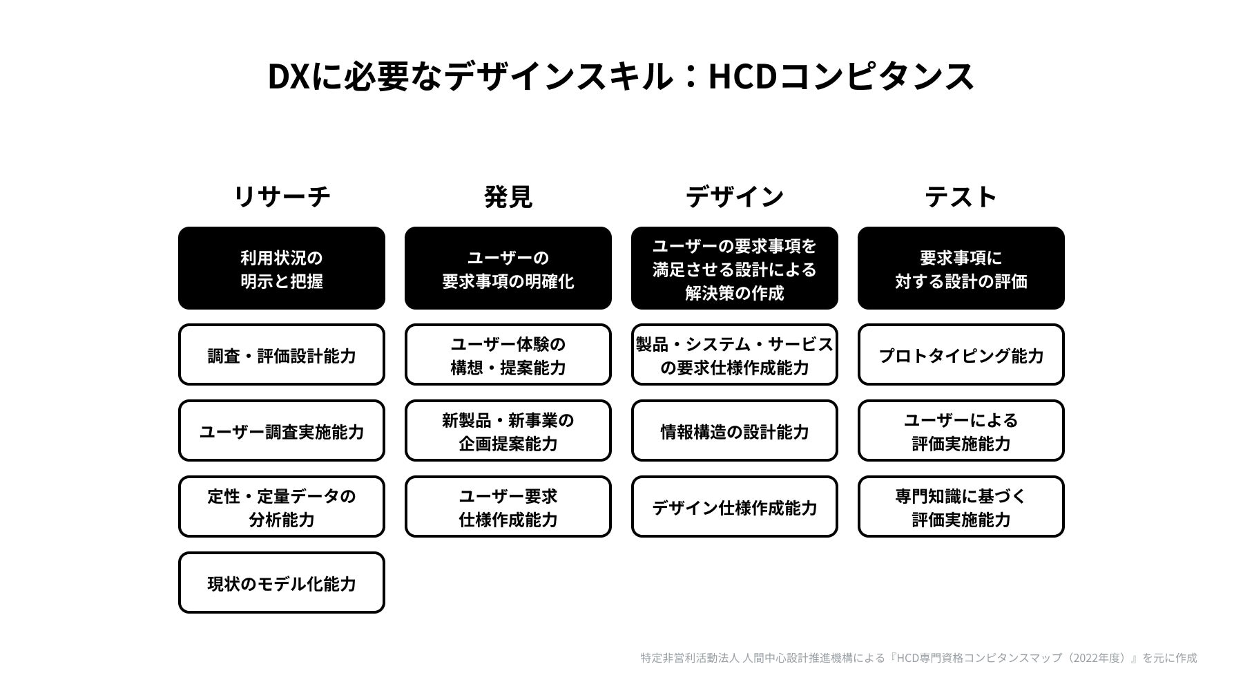 HCDコンピタンスとは、特定非営利活動法人 人間中心設計機構が提供する認定制度において定義されている、人間中心設計を活用したDXプロジェクトの推進に求められる能力群を指します。