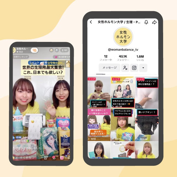 女性ホルモン大学では、生理や女性ホルモンに関する知識や女性特有の悩みに対するセルフケアの情報、生理用品やフェムケアグッズ、フェムテックアイテムの紹介などショート動画にて情報発信しています。2019年にYouTubeチャンネルを開設し、2021年7月からスタートしたTikTokではショート動画の再生回数が460万回を超えるなど大きな反響を頂き、おかげさまで現在TikTokでは4.6万人のフォロワーを獲得しています。週に1度行うTikTokライブは視聴者の疑問や悩みに答えたり、フェムテック専門店への取材や婦人科医との対談、生理用品開発者のインタビューなどの取材やコラボも行っています。