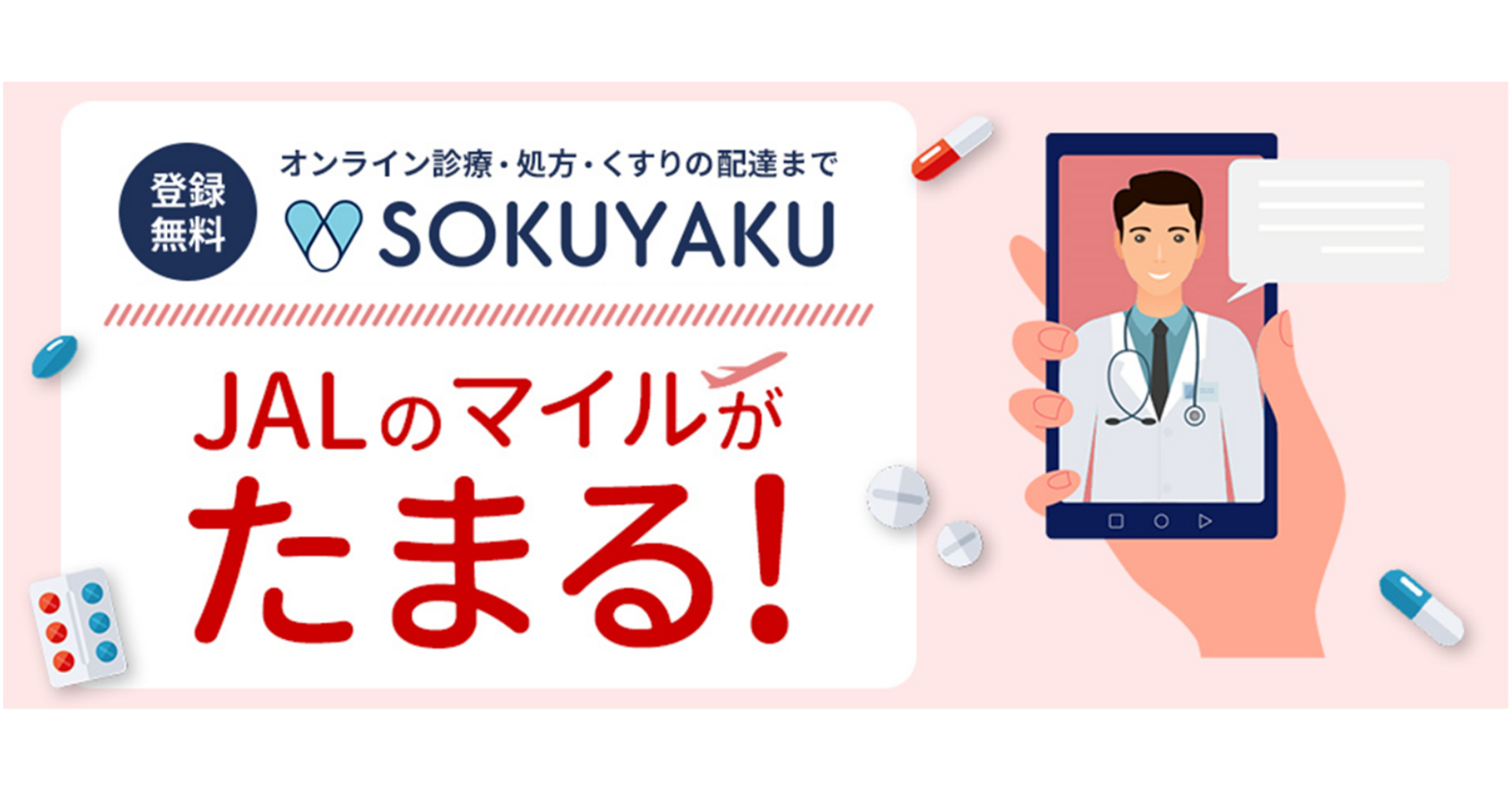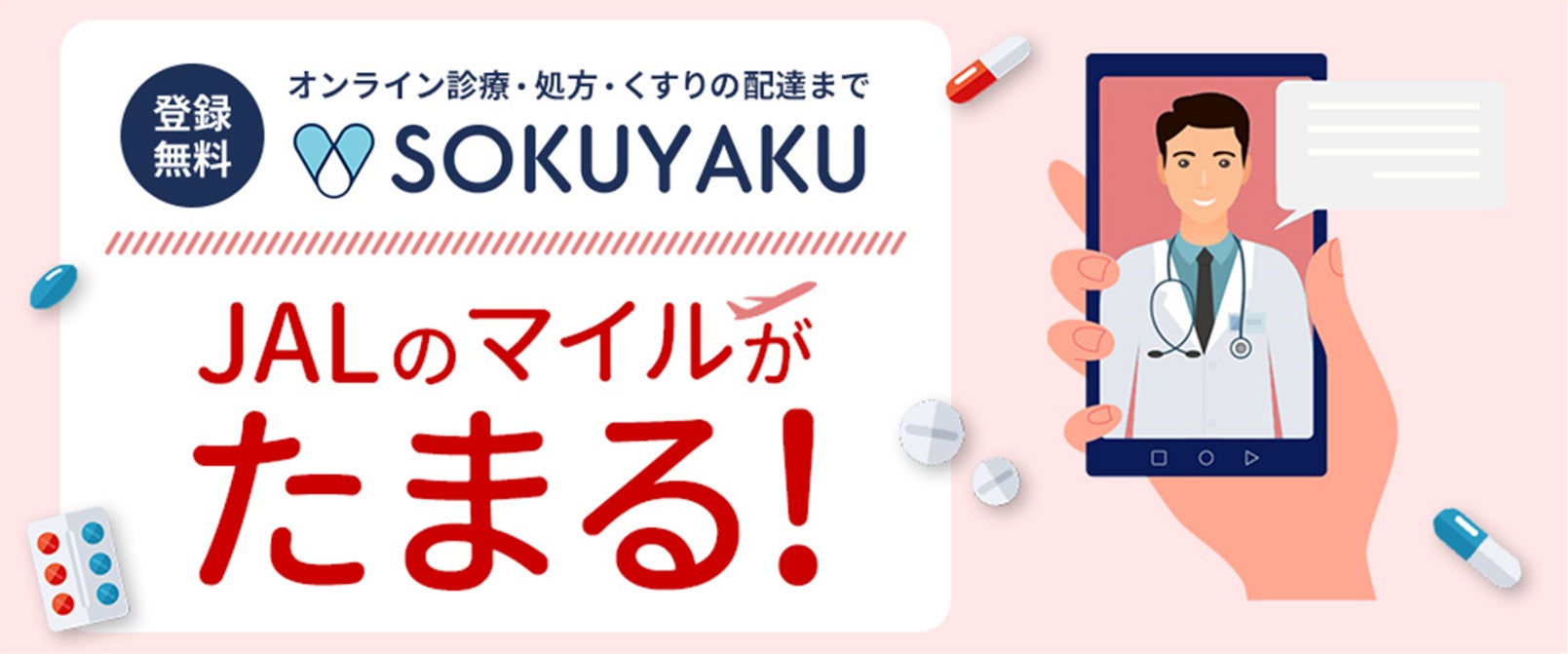 ジェイフロンティアとJALは業務提携し、オンライン診療アプリ「SOKUYAKU」の新規会員登録・ご利用でJALのマイルがたまるサービスを開始