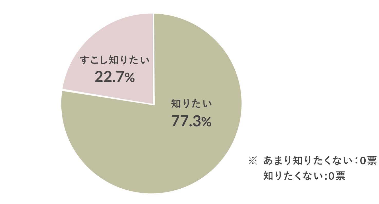 その結果、「あまり知りたくない」や「知りたくない」と答えた人は0。全員が「知りたい」または「すこし知りたい」と、水の大切さに興味があることがわかりました。