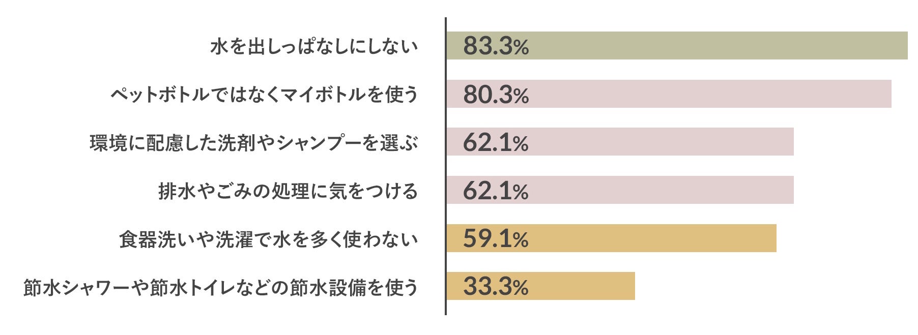 「水を出しっぱなしにしない」は83.3%、「ペットボトルの飲料ではなくマイボトルを使う」が80.3%。その他は、河川や海を汚さないように、排水や洗剤に気を付ける人も半数以上になりました。