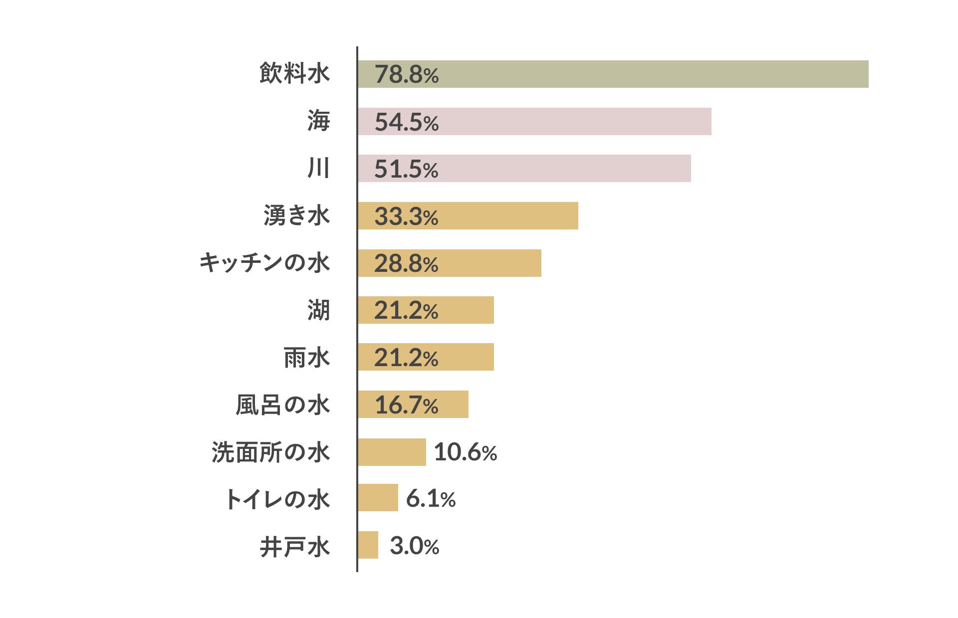 圧倒的に多かったのが「飲料水」の78.8%。次いで、「海」(54.5%)、「川」(51.5%)でした。飲料水を除くと、キッチン、風呂、洗面所などの家庭内の水よりも、海や川、湖などの自然のものをイメージする人が多い結果でした。