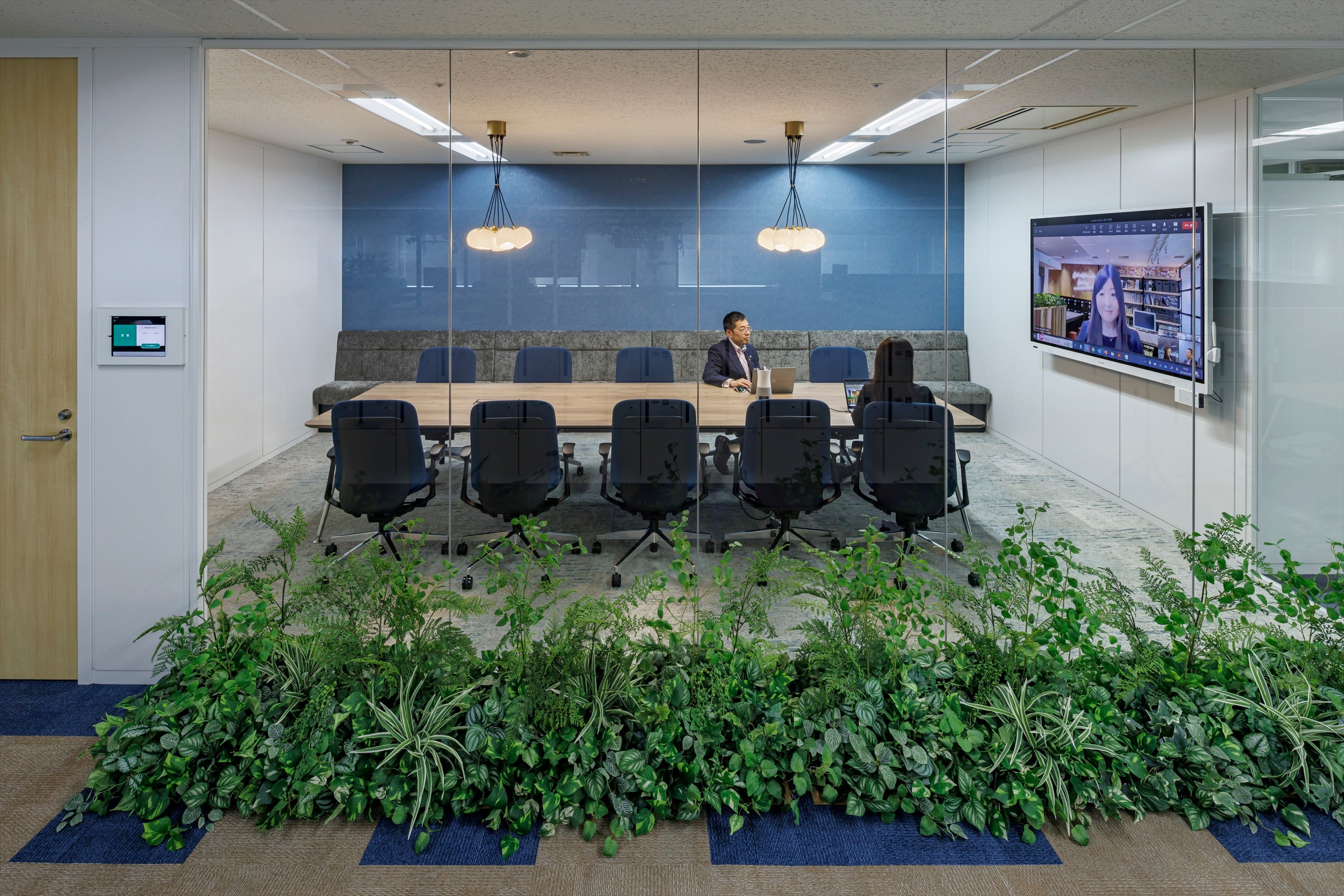 会議の内容や人数によって場所を選べる様々なスペースを構築しました。パソコンを持っていけばサッとWeb会議ができ、まるで同じ空間にいるかのような映像と音響設備を配置することでスムーズな会議をサポートします。