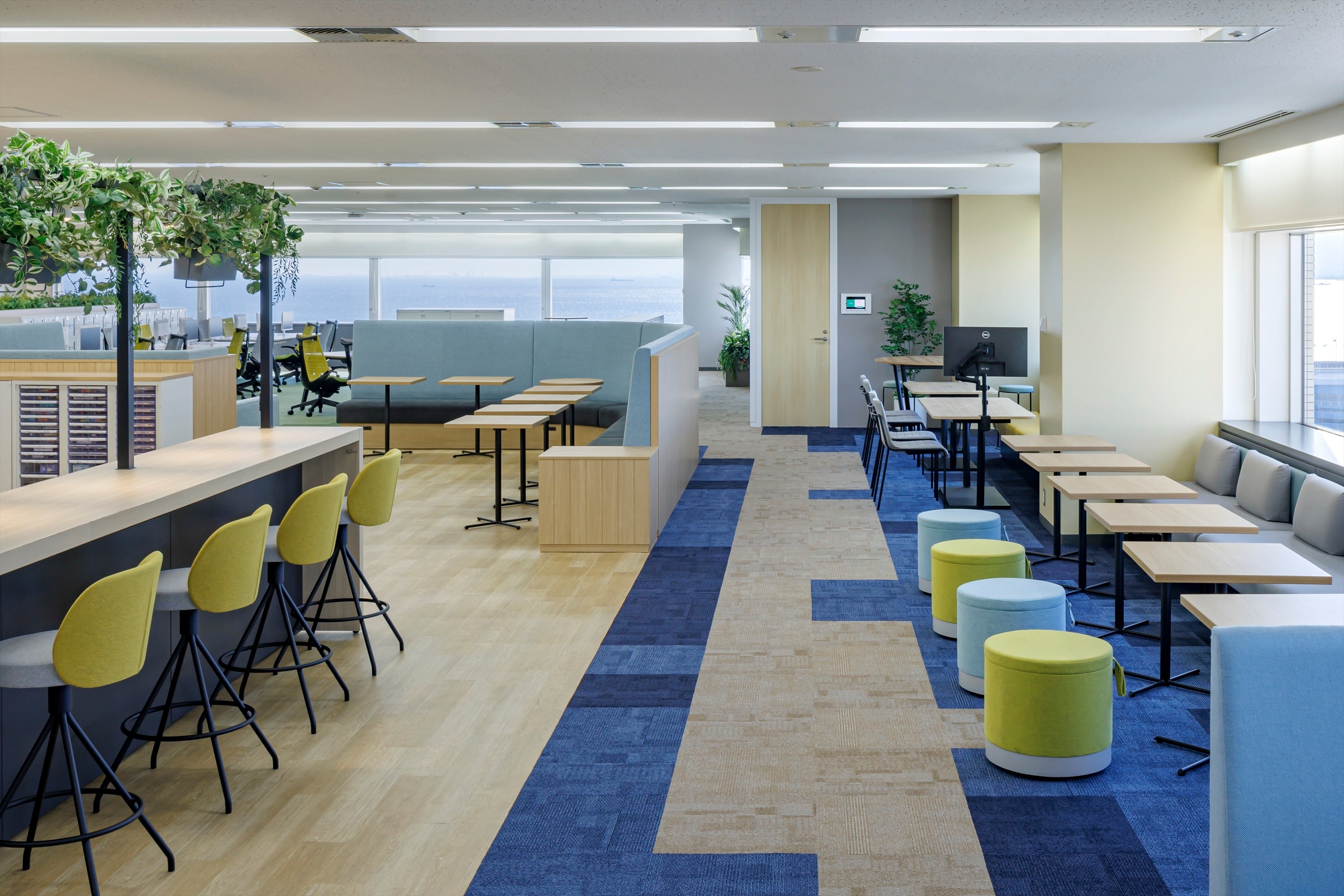 このような立地にあるリコージャパン千葉支社のViCreA 幕張は、『 ~明日へ出航するオフィス~Bay Cruise MAKUHARI 』をオフィスコンセプトとし、海をイメージした内装デザイン、そして社員の自主性とコミュニケーションを促すオフィス環境を整備しています。