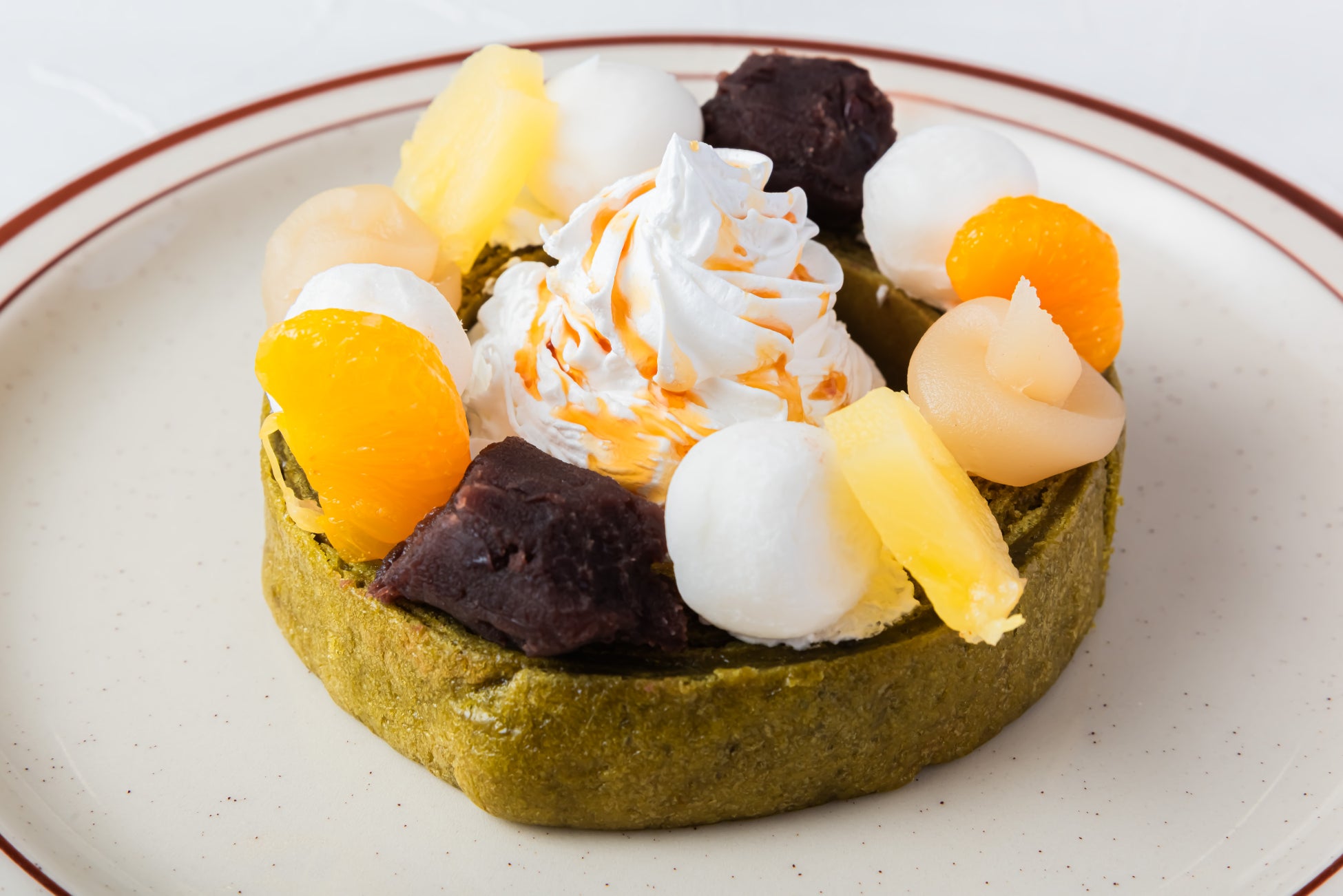 一本ずつ丁寧に焼き上げるライブ感あふれるバウムクーヘン。香ばしく幾重にも重ねたしっとり生地に、上品な抹茶の風味をまとわせました。仕上げには、なめらかな生クリーム、やさしい甘さの小豆、季節の果物を贅沢にトッピングした一品です。