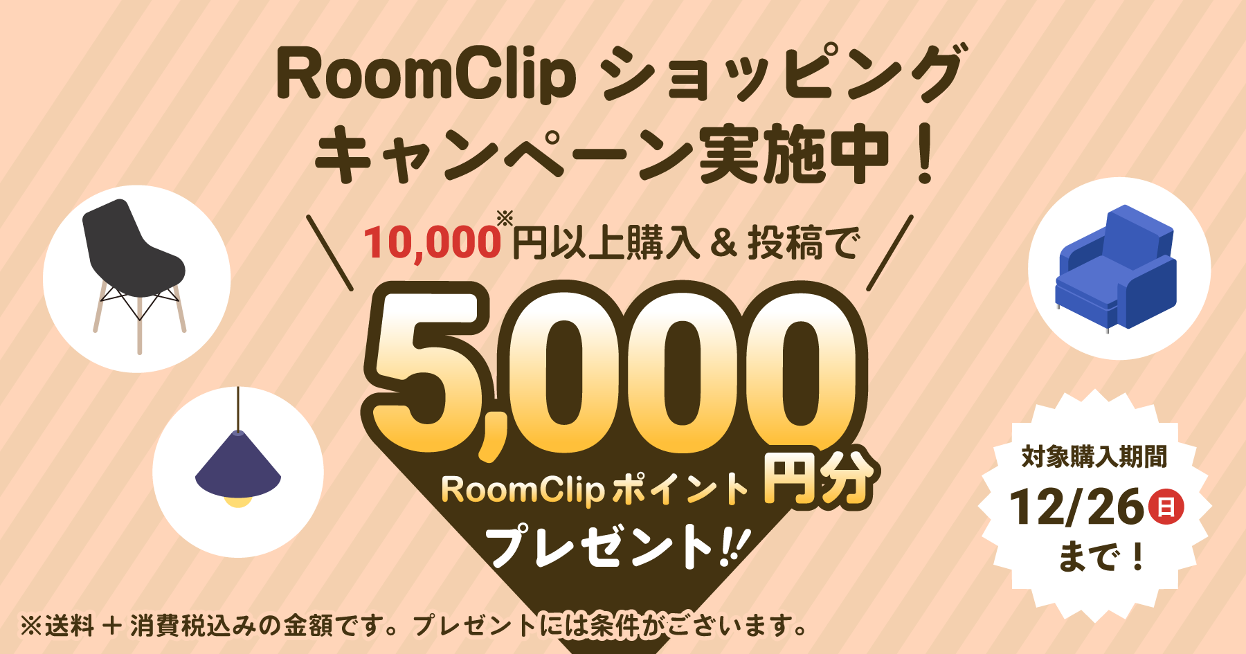 購入対象期間中にRoomClipショッピングで「消費税・送料込み10,000円以上」のお買い物をした後、そのアイテムの写真で写真投稿キャンペーンに参加した方に、「RoomClipポイント5,000円分」をプレゼントします。RoomClipポイントは、RoomClipショッピングでの買い物に使えます。