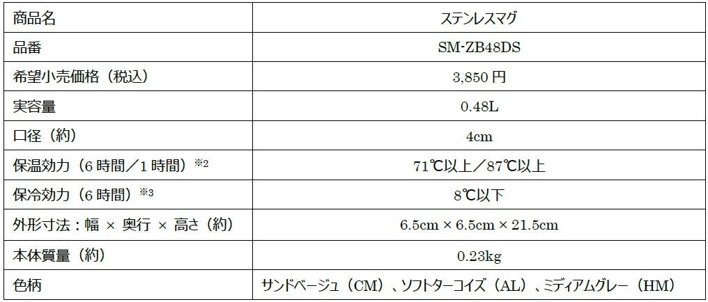 ※3 保冷効力とは、室温20℃±2℃において、製品に冷水を取扱説明書に記載の位置まで満たし、縦置きにした状態で水の温度が 4℃±1℃のときから6時間放置した場合におけるその水の温度。