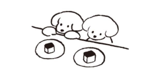サンドベージュ柄:テーブルのカステラが気になる子犬たち。 おやつの時間も、いつだって一緒。