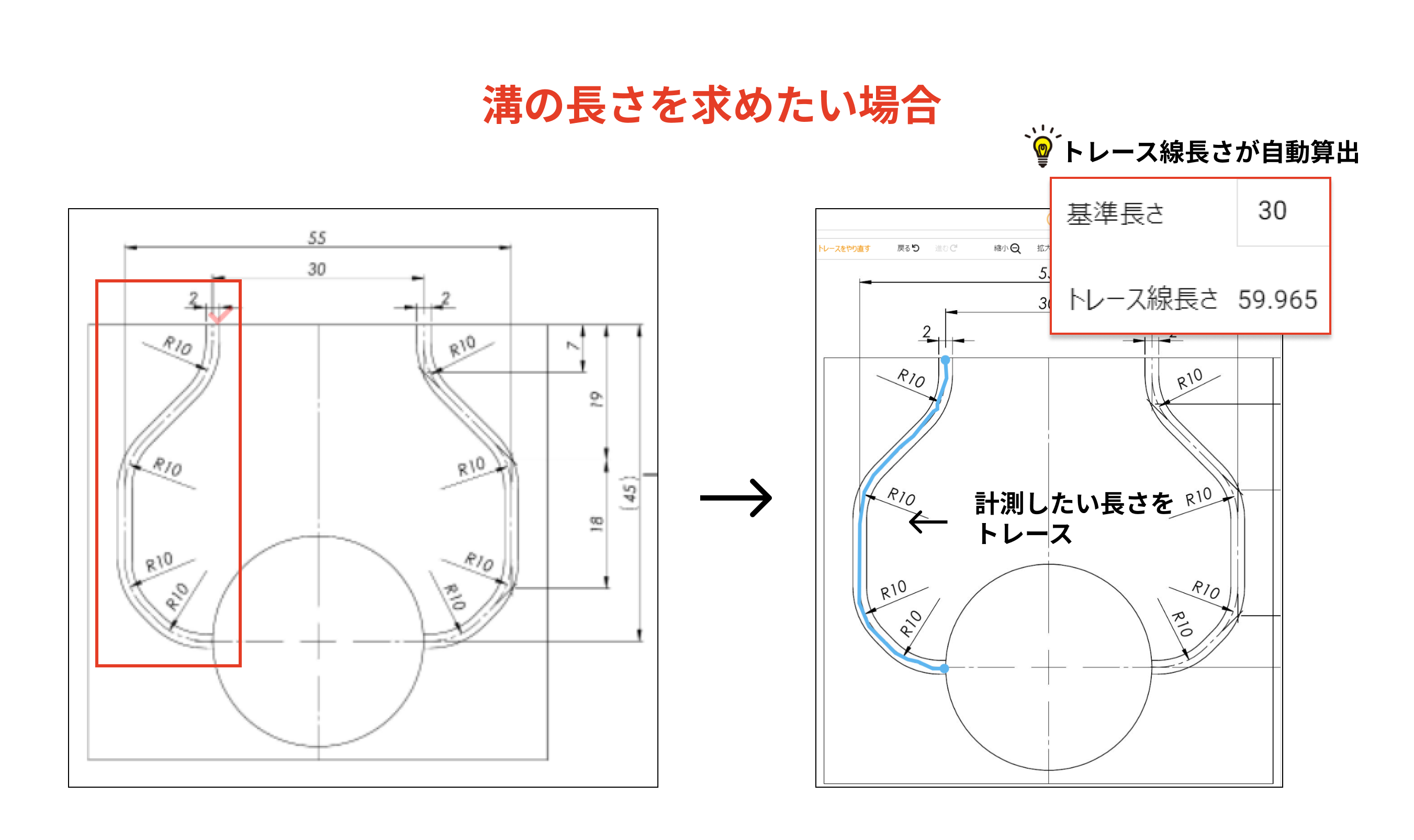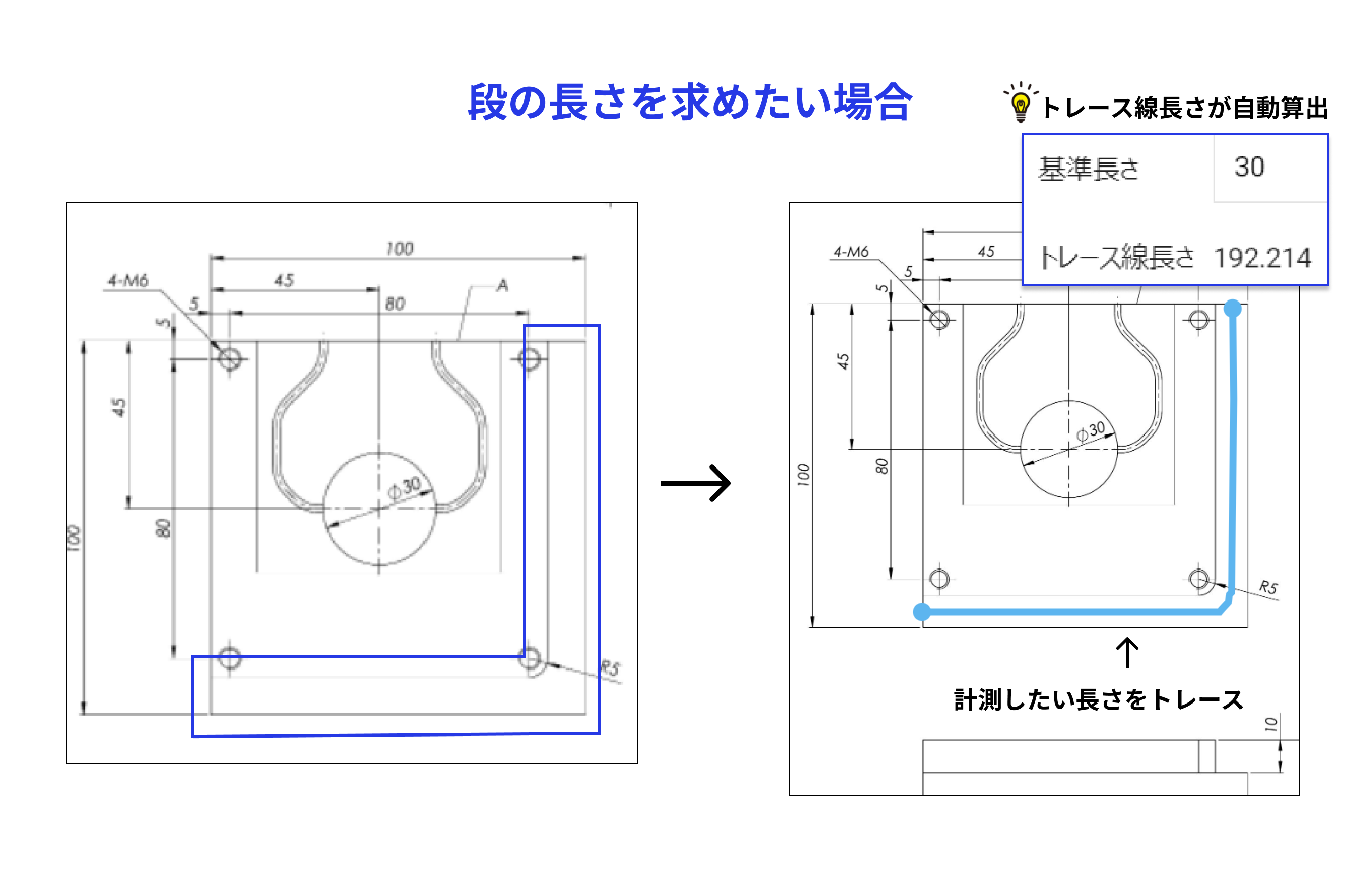 今回の機能追加では、ワイヤーカットの自由曲線の長さを計測する際に好評のトレース計測機能(図面上に寸法値の記載がない形状をなぞるだけで、長さを計測できる機能)を、段・溝などの加工形状の選択時においても使用できるようになりました。(ワイヤーカットのトレース計測機能の詳細についてはこちら:https://www.kabuku.co.jp/news/release-kabukucloud-0930/)