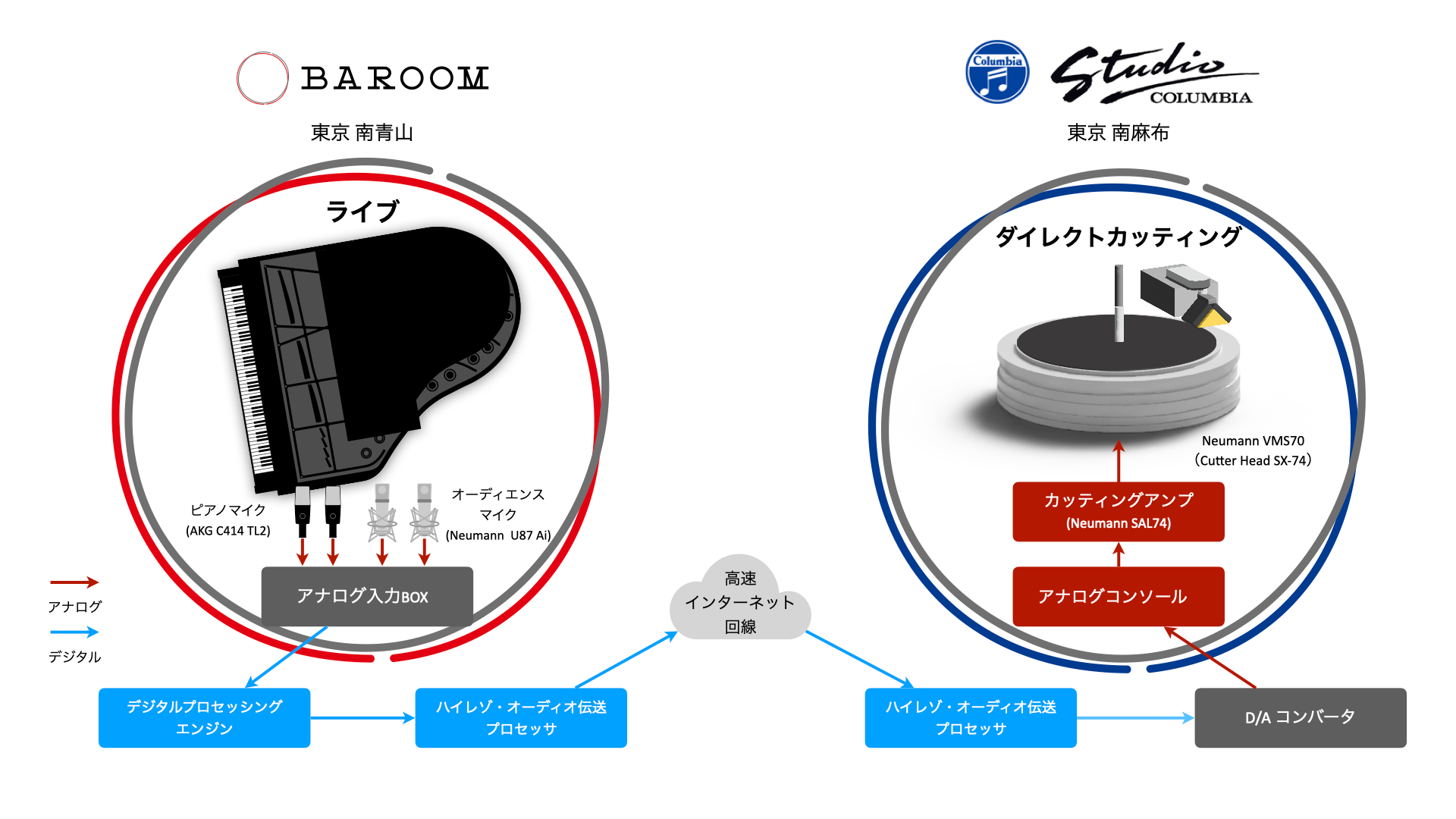 今回の「リモート・ダイレクト・カッティング」は、高速インターネット回線を用いて遠隔地と繋ぎ、会場での演奏をそのままカッティングいたしました。