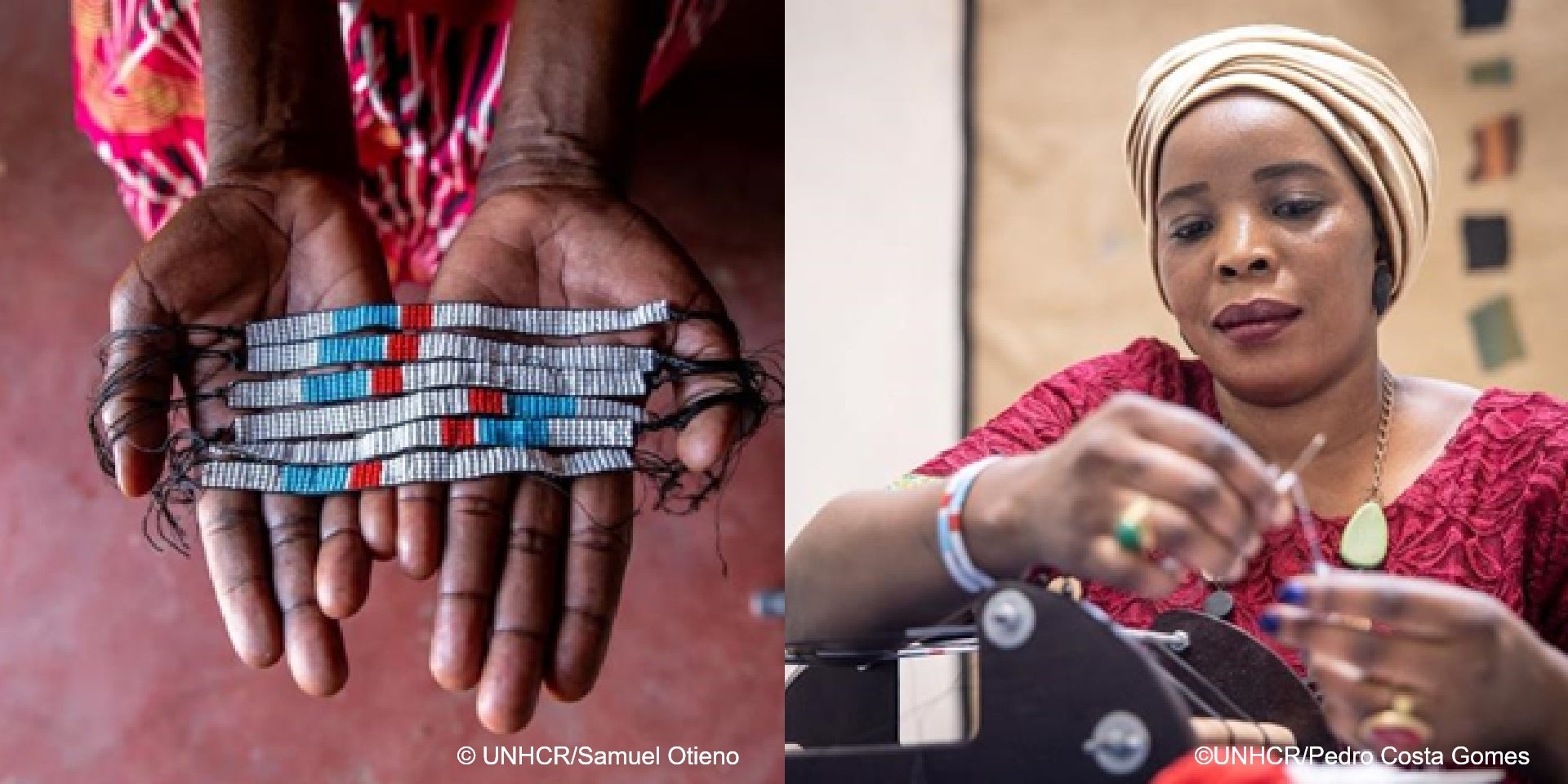 「難民一人ひとりが、避難先でも安全と尊厳をもって生活できるように」とUNHCRが2018年に立ち上げたグローバルブランド「MADE51」がUNIQLOと協力して制作したブレスレット。主に南スーダン難民の女性たちが、現在の避難先であるエジプト、エチオピア、ケニア、そして南スーダンで作りました。ビーズ工芸は、南スーダン地域の伝統的な手法で、デザインや色が文化的な意味合いを持つと言われています。ブレスレットに使用されている色合いは「#難民とともに」というUNHCRとUNIQLOのパートナーシップを象徴しています。