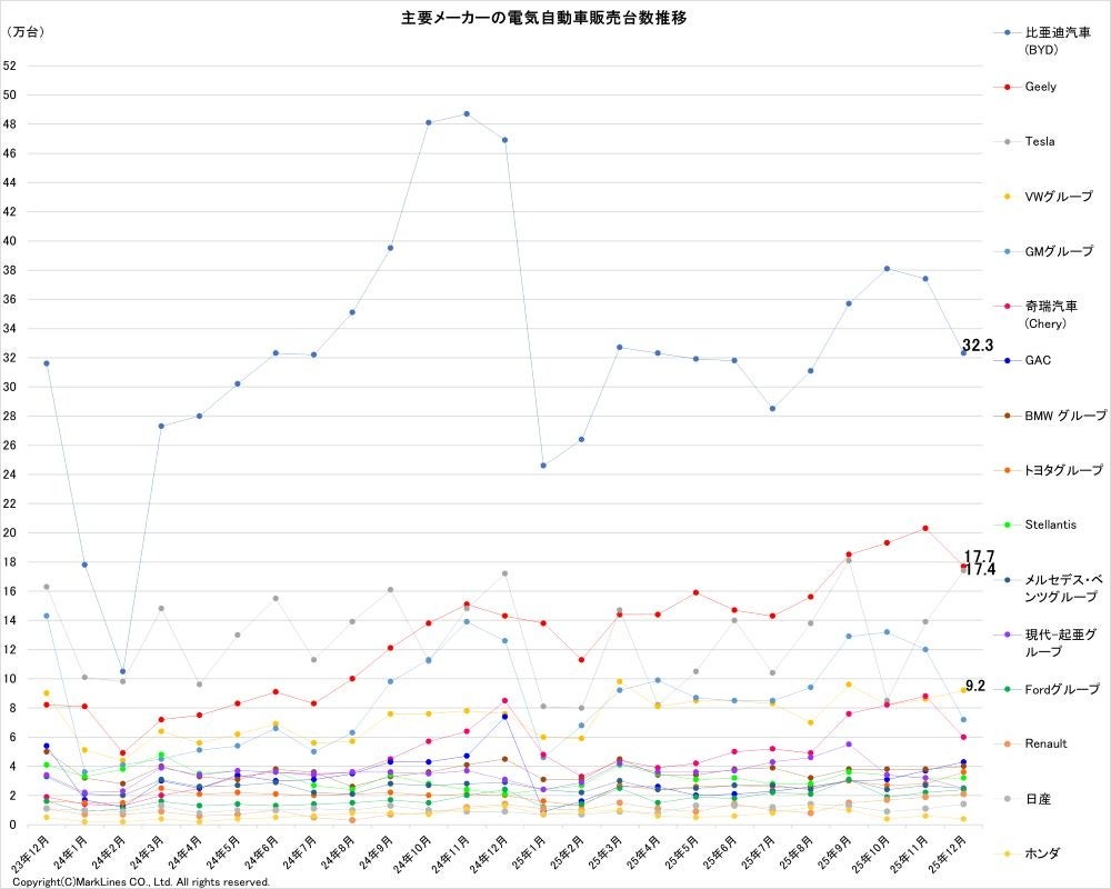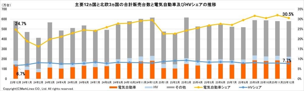 マークラインズ株式会社(本社:東京都港区、代表取締役社長:酒井 誠、http://www.marklines.com/) は、電気自動車の世界販売の約90%をカバーする主要15カ国を対象にグローバル市場における電気自動車の台数情報及び販売動向を分析した2025年12月の電気自動車(BEV/PHV/FCV)販売月報(商用車を除く、推計値を含む)を掲載しました。