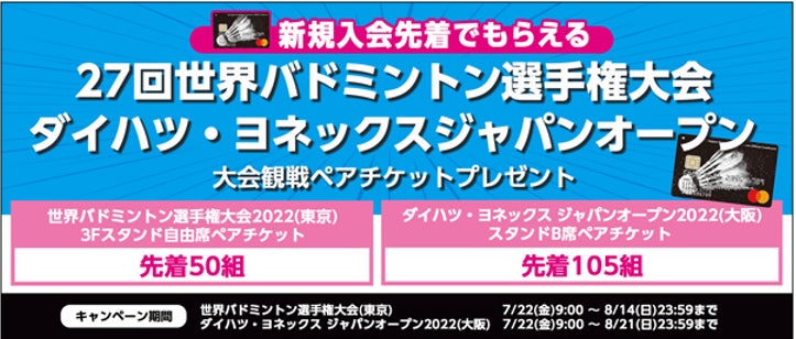 『世界バドミントン選手権大会(東京)』、『ダイハツ・ヨネックス ジャパンオープン2022(大阪)』いずれかの観戦ペアチケットを、先着でプレゼント企画を実施しております。