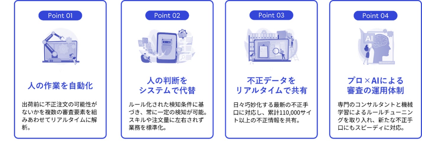 事業者側で必要だった不正注文の処理(チェック、出荷止め)が完全自動化されるため、業務効率が向上します。