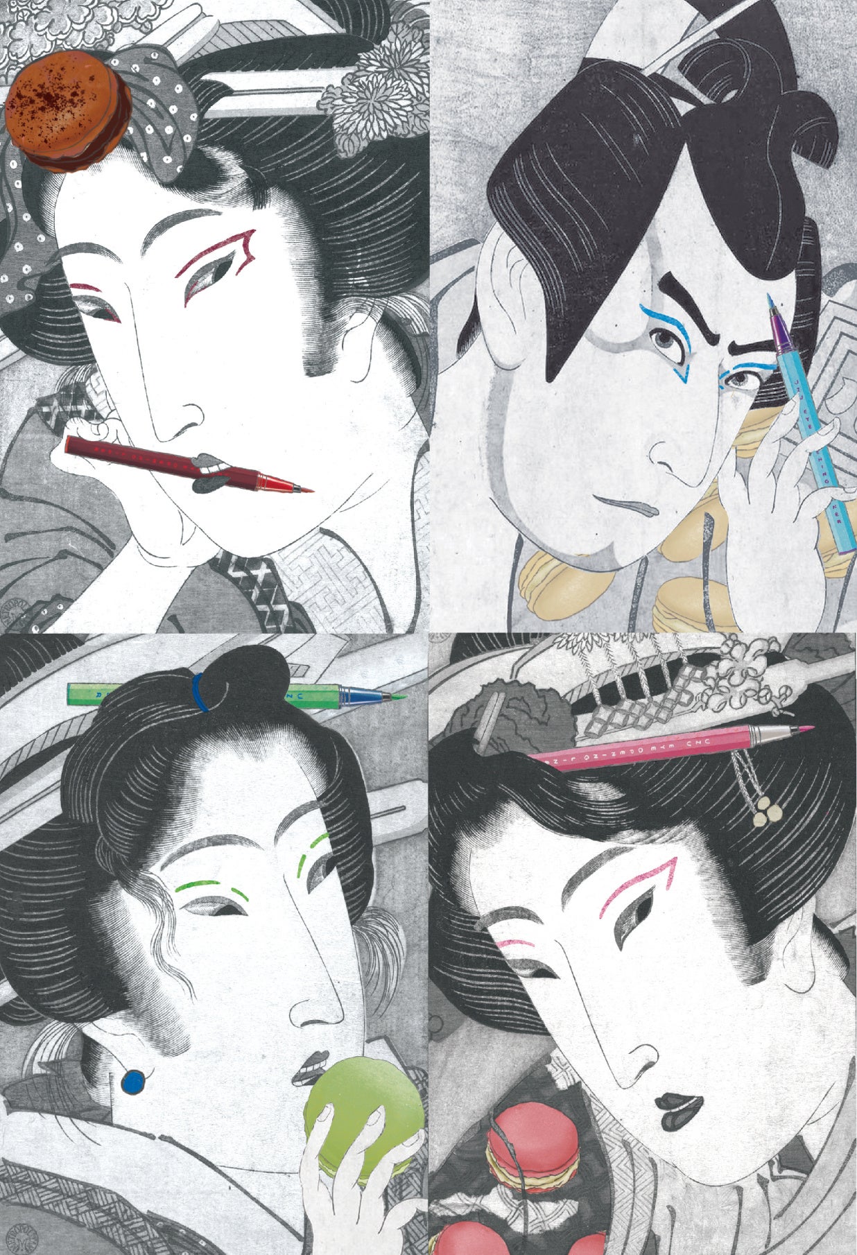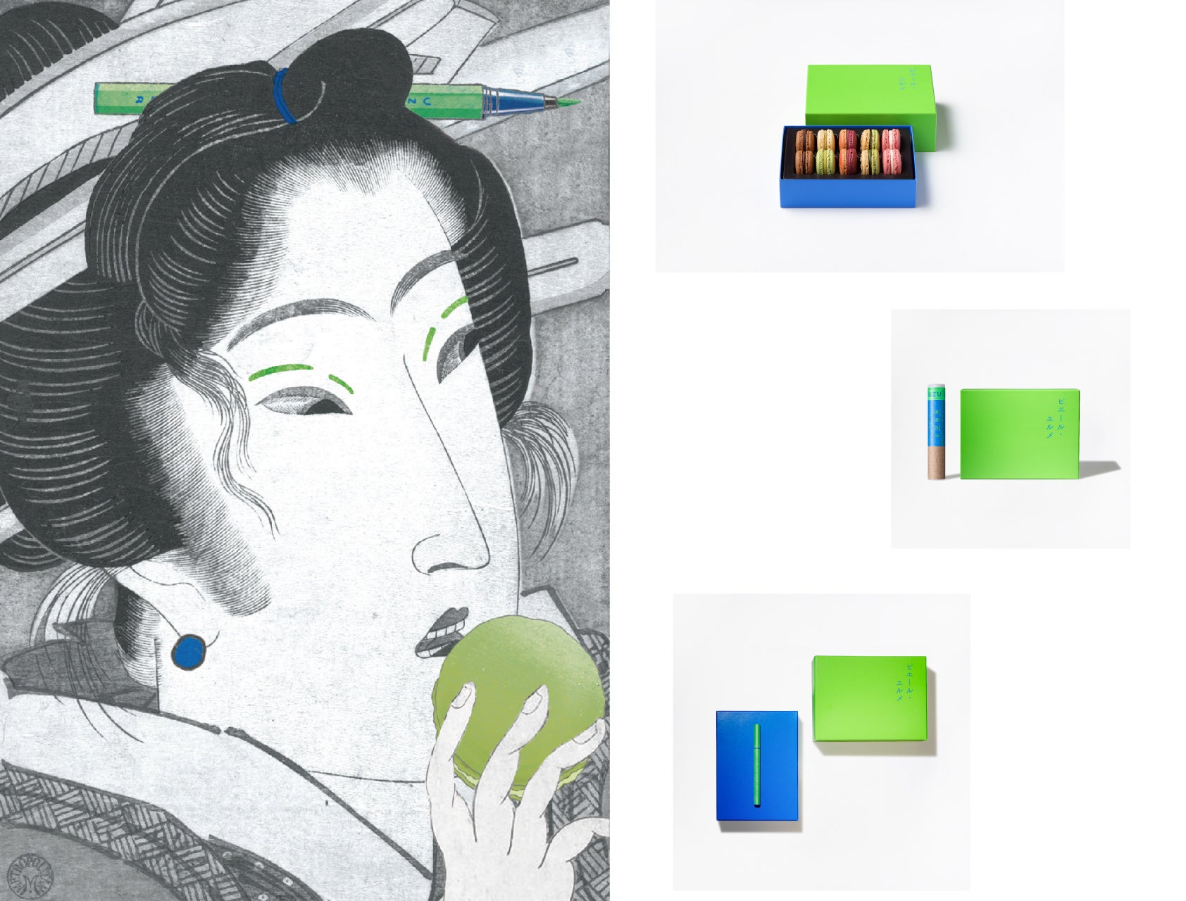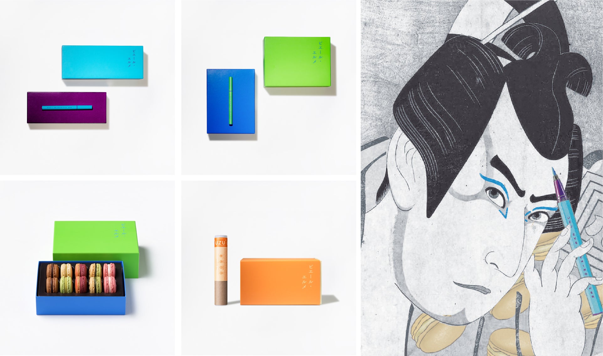一見日本の伝統的な浮世絵のあちこちに、マカロンが“鎮座“している…そんなユーモアとウィットに溢れたビジュアルを、ギフトボックスとして展開している『Made in ピエール・エルメ』。今回のコラボレーションのために特別に、UZUのカラーアイライナーも参加したビジュアルが登場。色とりどりのマカロンとアイライナーが、時空を超えた男女をカラフルに、プレイフルに彩ります。