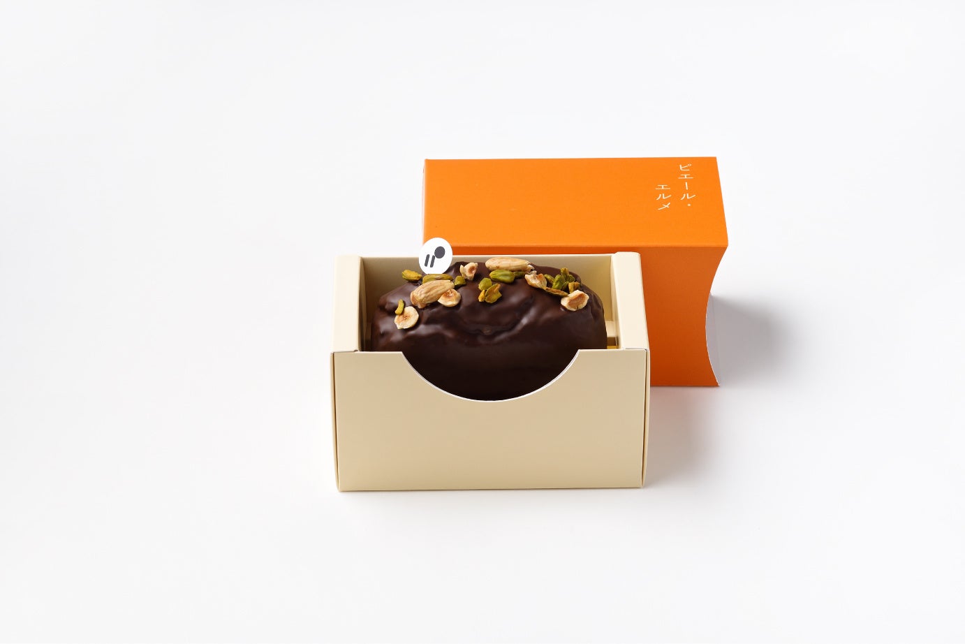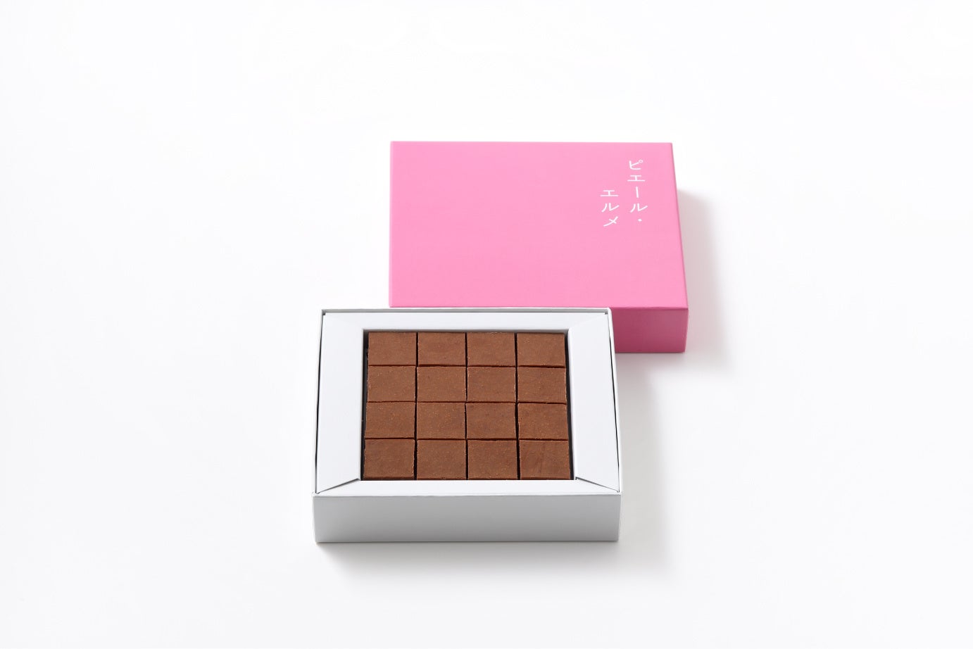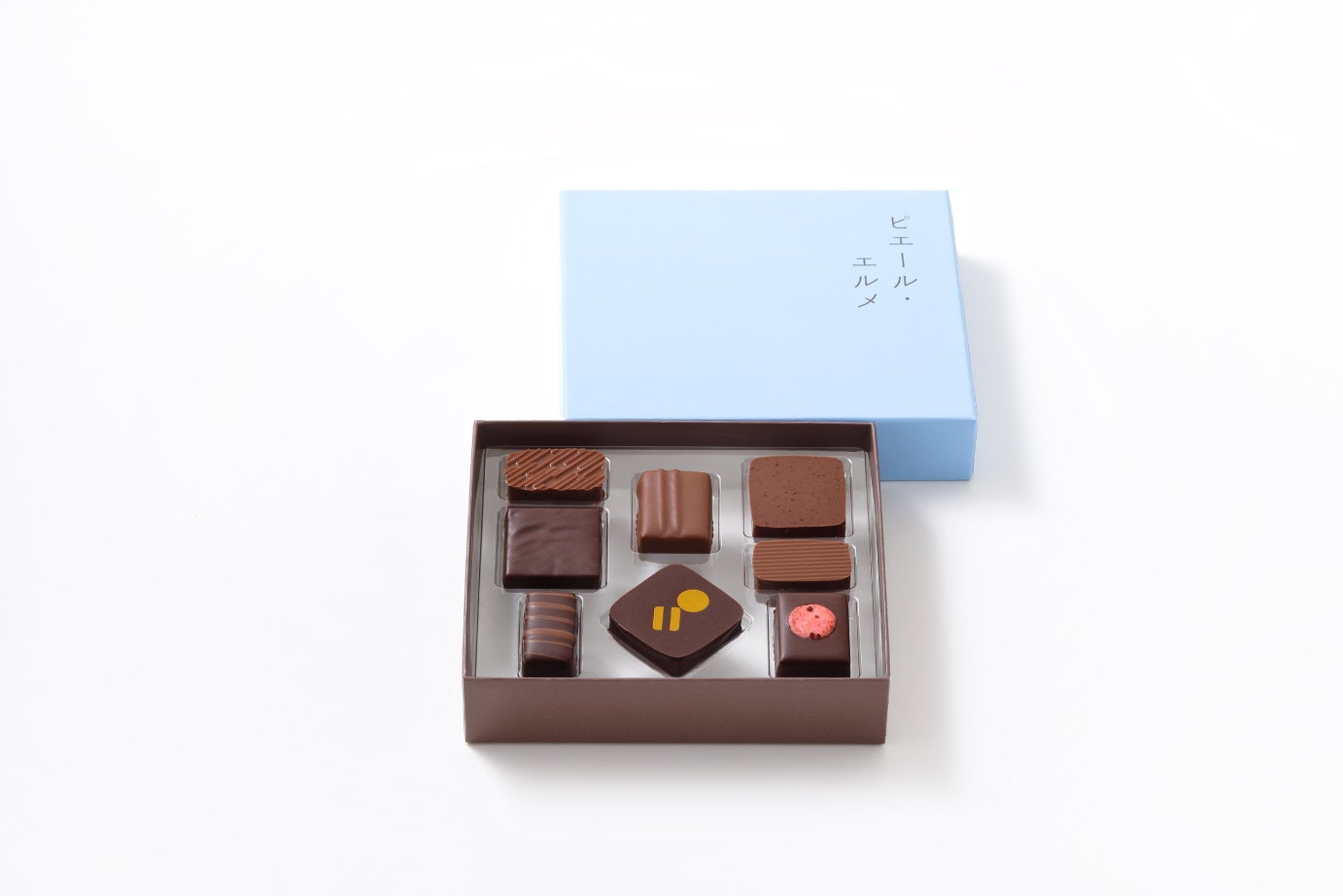 チョコレートはピエール・エルメの大好きな素材のひとつ。“パティスリー界のピカソ” と称される彼のチョコレートには、独特の輝き、まろやかさ、芳香があります。『Made in ピエール・エルメ』では、5周年を機にデビューした家紋風ロゴをあしらったチョコレートや、和素材を使用したトリュフチョコレートを『EYE OPENING LINER』を思わせるバイカラーのボックスに詰め合わせました。
