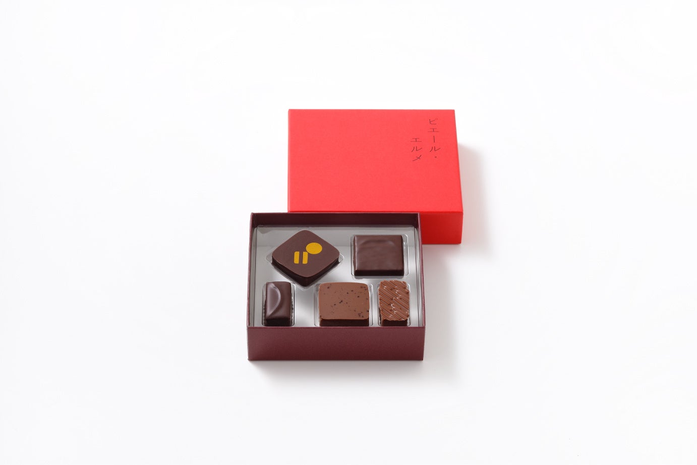 バニラ風味ビターチョコレート、カカオ片入りヌガティーヌ入りビターチョコレート、カシス風味ビターチョコレート、パッションフルーツ風味ミルクチョコレート、キャラメリゼしたミルクチョコレート