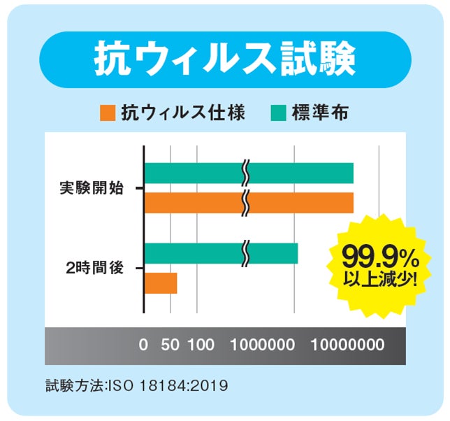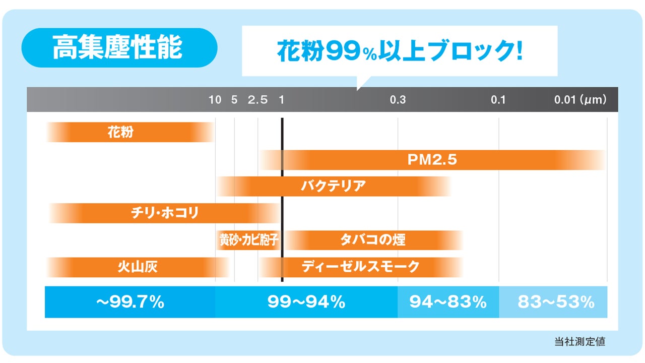 ・活性炭による脱臭効果 ・抗ウイルス効果(99.9%以上減少) ・抗アレル物質効果(約95%減少) ・抗菌効果(99%以上減少) ・花粉、ダニなどにも対応 |