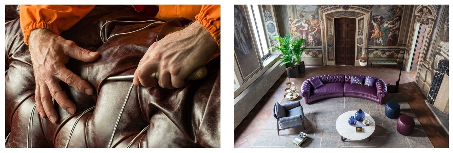 独特な柔らかさを持つ最高級の革「ペレ・フラウ」は、厳選された上質な仔牛の皮を丁寧に加工し、厳格な品質管理を経て生まれます。やわらかく肌に馴染むこの革は、曲線を表現するのに最適。この革があってこそ、ポルトローナ・フラウの“家具芸術”なのです。