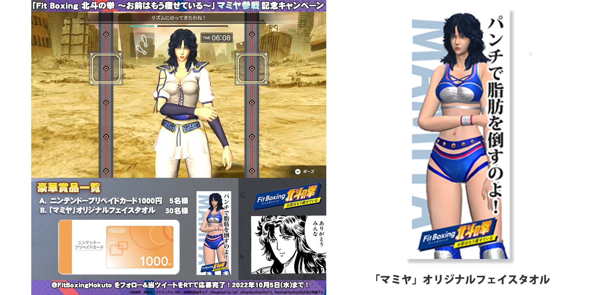 「Fit Boxing 北斗の拳」へのマミヤの登場を記念して、「マミヤ」オリジナルフェイスタオルやニンテンドープリペイドカード1,000円が当たるTwitterキャンペーンを開催します。キャンペーン詳細は「Fit Boxing 北斗の拳」公式Twitterアカウント(https://twitter.com/FitBoxingHokuto)にてご確認ください。