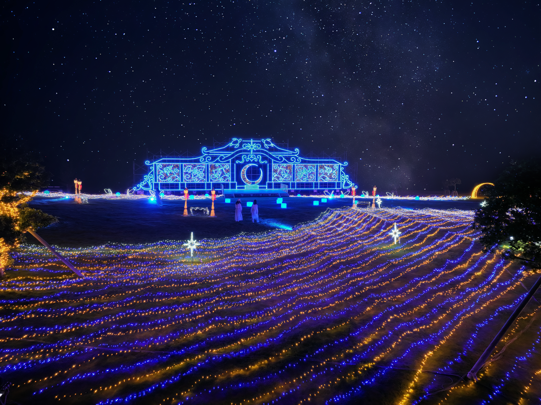 ホテルのサウスウイング側に位置する、約4,000平米の緑豊かな自然が広がるメインエリアは、日が暮れるとともに壮麗な光と音のシンフォニーが織り成す幻想的な空間へと変貌します。一面に広がる無数の光が波のように輝き、まるで光の海原に漂っているかのような神秘的な感覚をご体感いただけます。また、エリア中央には、幅34メートル、高さ7メートルの壮大な月の神殿「琉球城」が姿を現し、圧倒的な美しさと幻想的な雰囲気で皆様を魅了します。15分に1回行われる音と光の演出や、没入感を体験できる多数のフォトスポットでの撮影もお楽しみいただけます。
