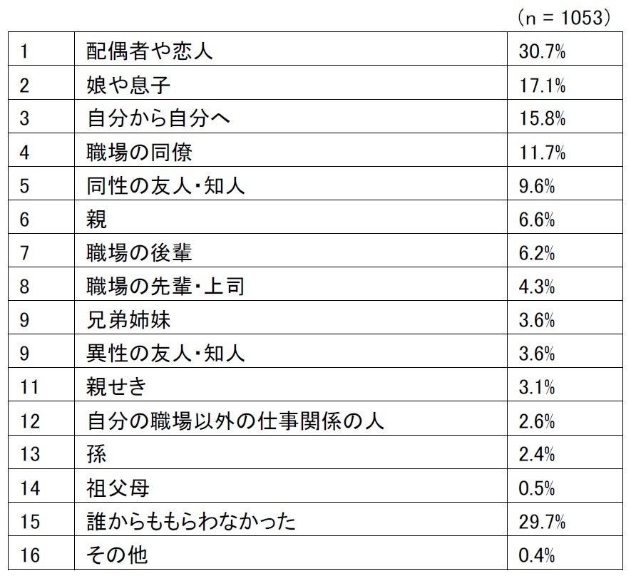 ◆昨年(2021年)バレンタインギフトを貰った相手としては、「配偶者や恋人」が30ポイント以上と最も多かった。自分用に購入する方も15ポイント以上と比較的多い傾向にあり、職場でのバレンタインギフトのやり取りも合計で約22%とコロナ禍においても根強いものとなっている。