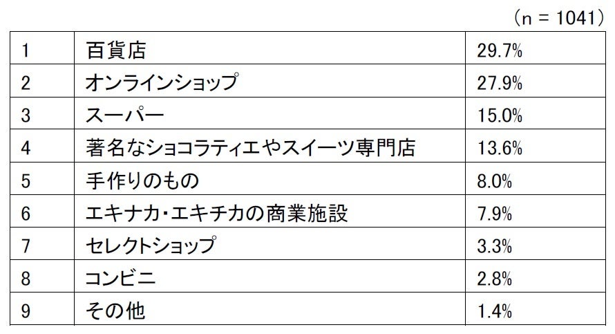 ◆バレンタインギフトの購入場所について、コロナ禍以前(2020年まで)は百貨店で購入する方が半数以上おり、商業施設や専門店、スーパーなどの店頭での購入が多い傾向にあったが、昨年はオンラインショップでの購入が増加し、百貨店をはじめ店舗に足を運ぶものに関しては大幅に減少した。今年の購入場所は、百貨店など一部で店頭回帰が見られるが、オンラインショップでの購入は27.9%とさらに比率を上げている。