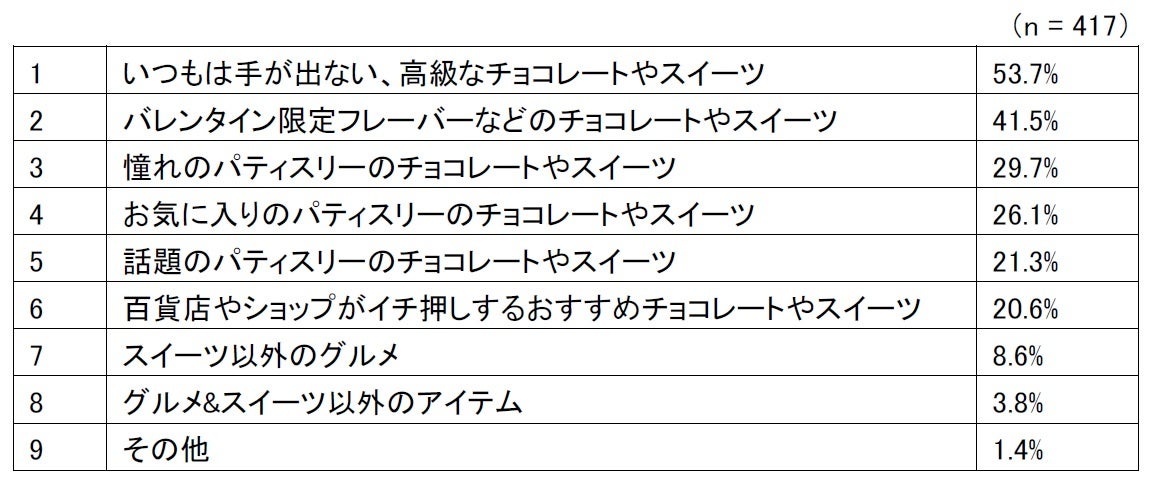 ◆自分へのご褒美ギフトとしては、「いつもは手が出ない高級なチョコレートやスイーツ」「バレンタイン限定フレーバーなどのチョコレートやスイーツ」といった特別感のあるものが好まれる傾向にある。