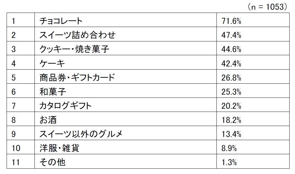 ◆バレンタインにもらってうれしいギフトは、次点に20ポイント以上の差をつけてチョコレートが1位となり、定番であり圧倒的な人気を誇っている。商品券・ギフトカードやカタログギフトもどちらも20ポイント以上獲得するなど、もらってうれしいと思っている方が多くいることが分かった。