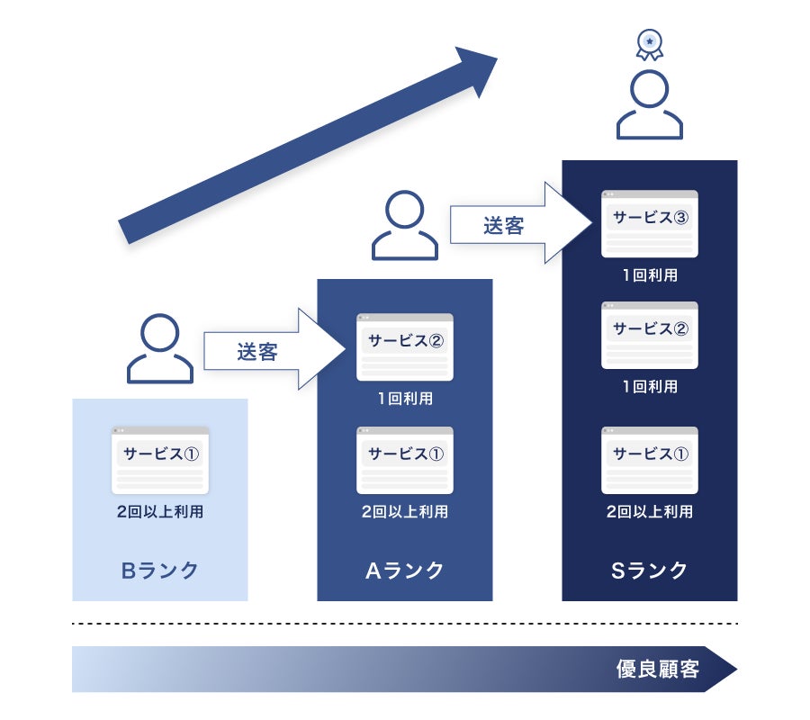 顧客がまだ利用したことのないサービスへの誘導によって顧客ランクを上げ、優良顧客化に繋げる例です。各サービスの利用状況を整理し、条件に応じた顧客ランクを定めます。
