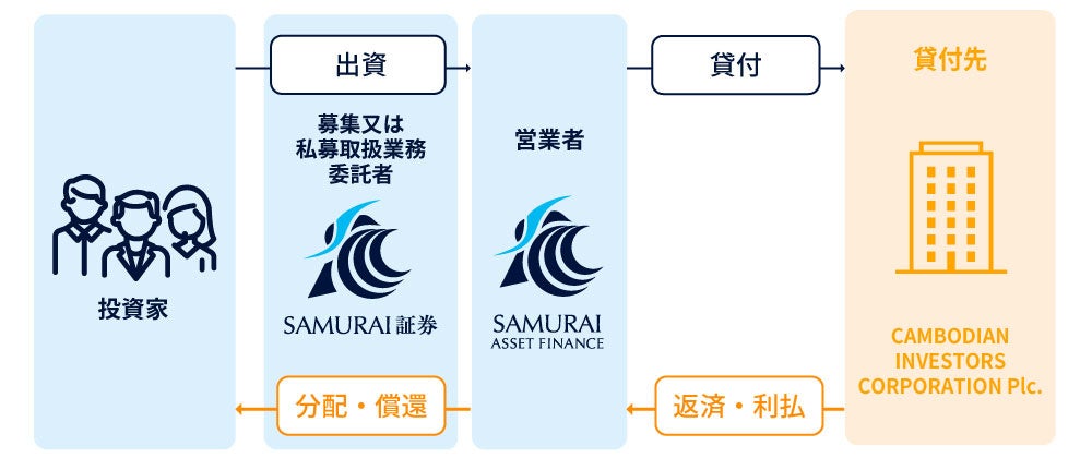このファンドは、SAMURAI ASSET FINANCE株式会社(以下、「営業者」といいます。)がCAMBODIAN INVESTORS CORPORATION Plc.(以下、「本貸付先」といいます。)に対して貸し付けする貸付型クラウドファンディングとなります。