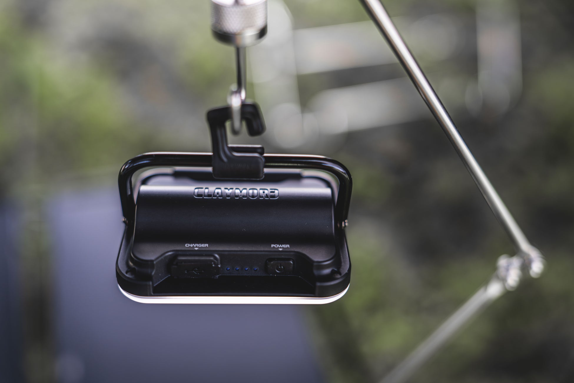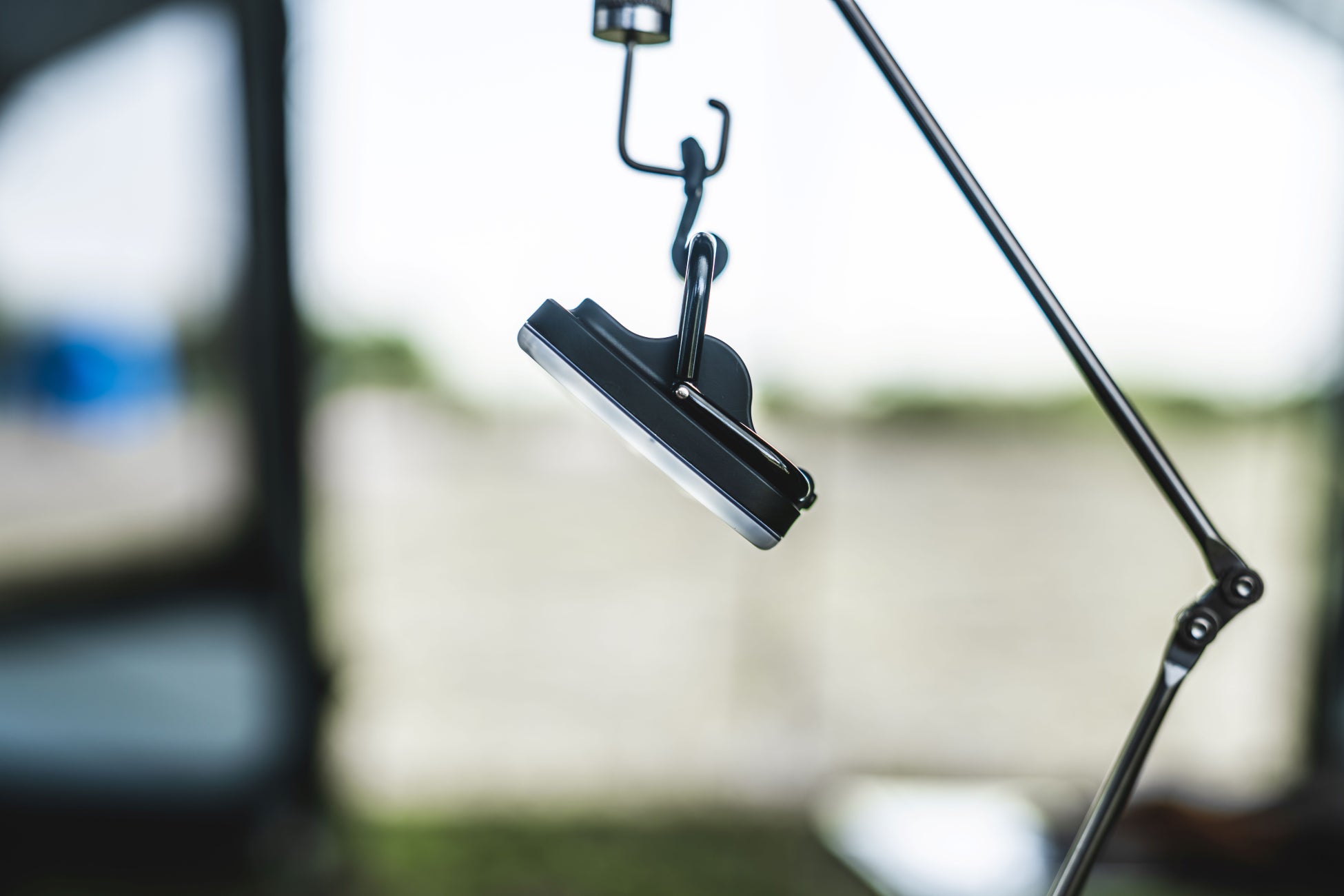 本体の裏面にはハンドルワイヤーが搭載されており、地面やテーブルの上に安定して置くことができます。置き型ライトとしても活躍し、さまざまなシーンで手軽に使える便利な設計です。