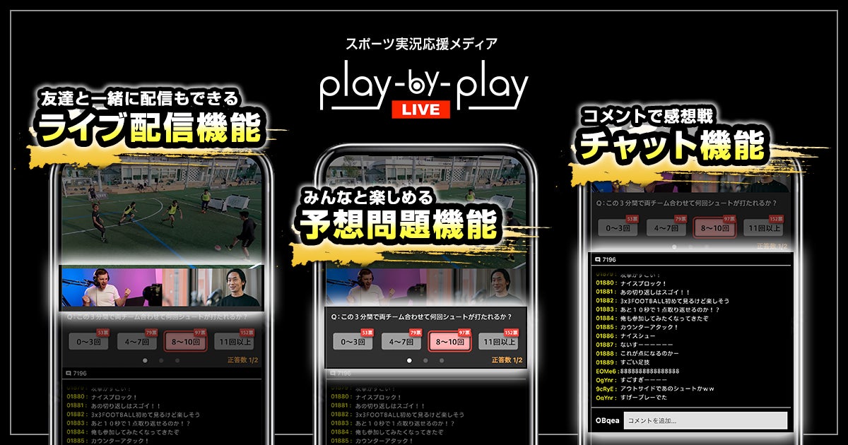 「play-by-play LIVE」は将来的に、個人が試合映像を利用して、自由に応援実況できるサービスを目指しますが、まずはサービスのクオリティー向上を目的として、運営が用意した応援実況者の方に配信をおこなっていただきます。テスト配信として、3人制サッカーのチャンピオンを決める「3x3FOOTBALL CHAMPIONSHIP supported by play-by-play LIVE」を配信します。優勝、準優勝チームは、エキシビジョンマッチとして、元サッカー日本代表チーム、フットサルレジェンドチームなどのスペシャルチームと戦う「3x3FOOTBALL DREAM BATTLE supported by play-by-play LIVE」も開催する予定です。