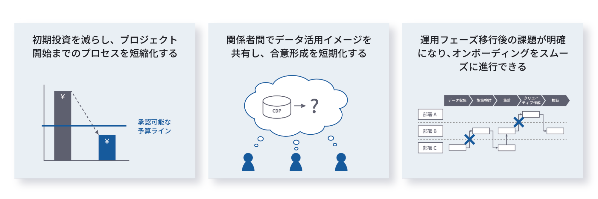 昨今、企業のマーケティング活動においてもDX(デジタル・トランスフォーメーション)が求められており、CDPの導入を検討する企業が増えています。しかし、組織間の合意形成あるいはCDPの構築に時間がかかり、施策の実施になかなかたどり着けないケースも多くあります。