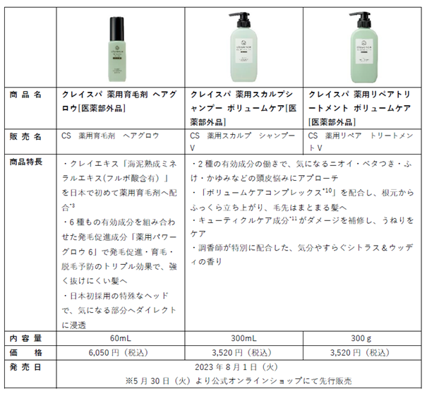希少なクレイエキス*²を日本で初めて薬用育毛剤へ配合*³した「クレイスパ 薬用育毛剤 ヘアグロウ[医薬部外品]」を中心に3アイテムを展開します。