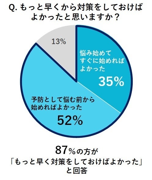 行ったところ、髪悩みの第1位が白髪、2位に髪ダメージ、そして3位に薄毛の悩みがあがっていることが分かりました*⁶。また、薄毛悩みを解決するための対策としてスカルプケアアイテムを利用する方は、半数近くを占めていますが、「もっと早く対策を始めていれば良かった」と感じている人が87%*⁷を占めていました。その一方で、継続しても半年以内に対策をやめてしまう方が62%*⁶いることも分かりました。