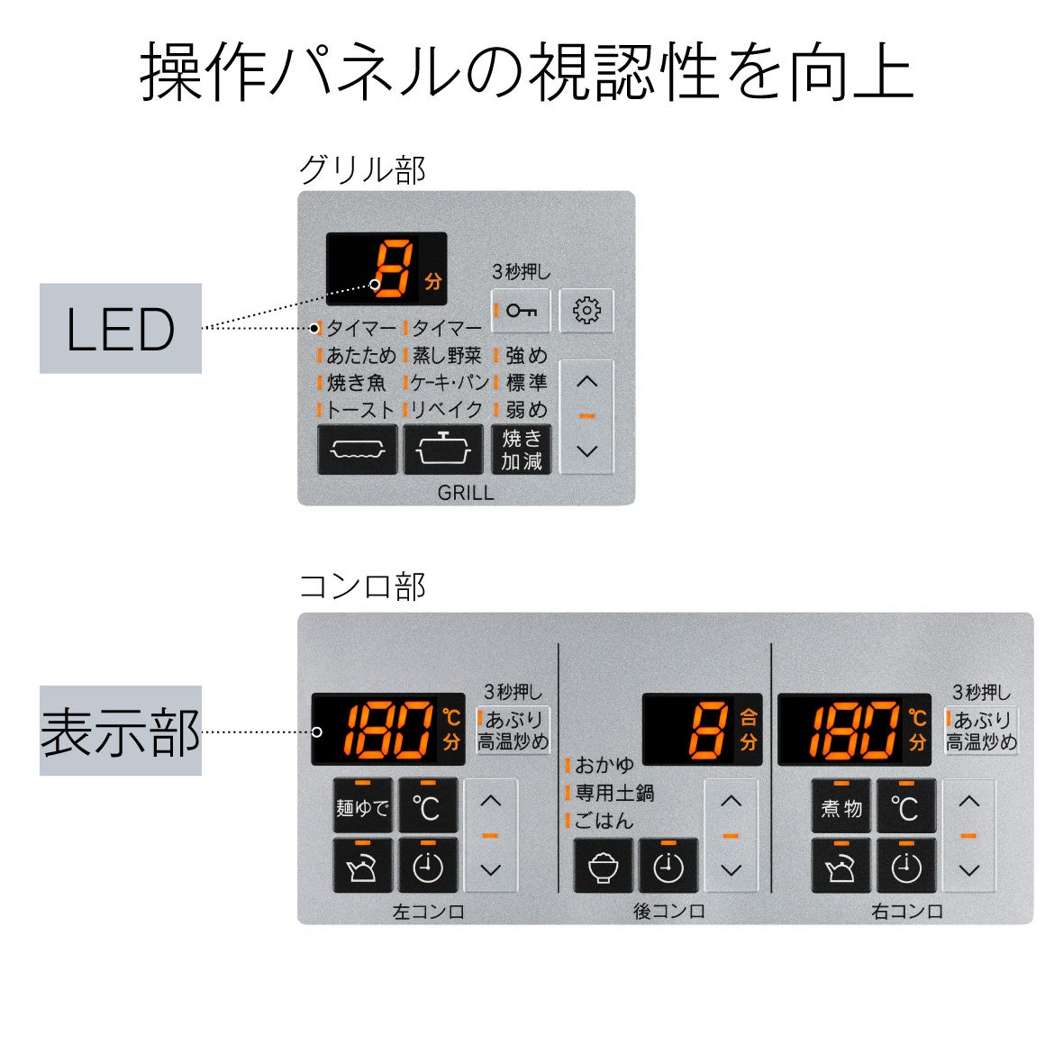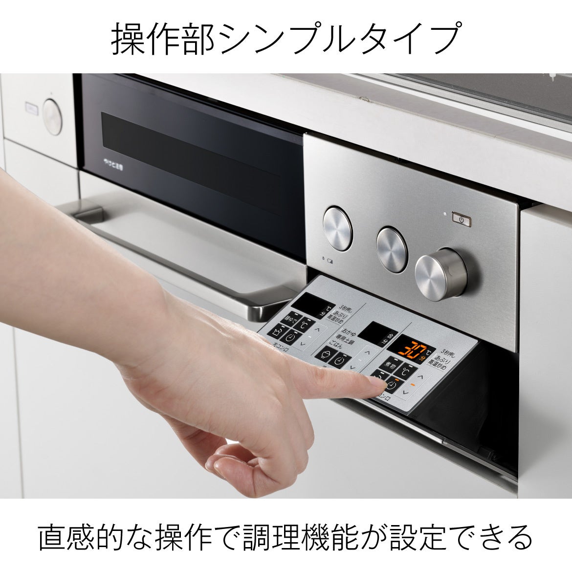 「DELICIA」は、安全性や調理性能に優れた当社最上級モデルのコンロです。「操作部シンプルタイプ」は、操作パネルを温度や時間の表示部とスイッチのみで構成しており、直感的な操作で調理機能が設定できます。