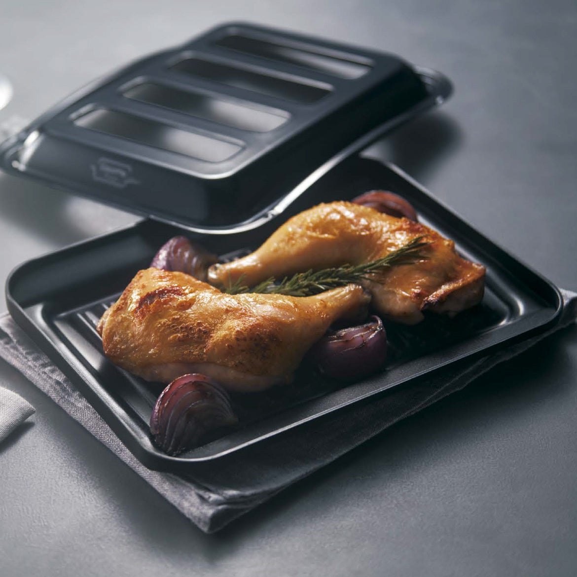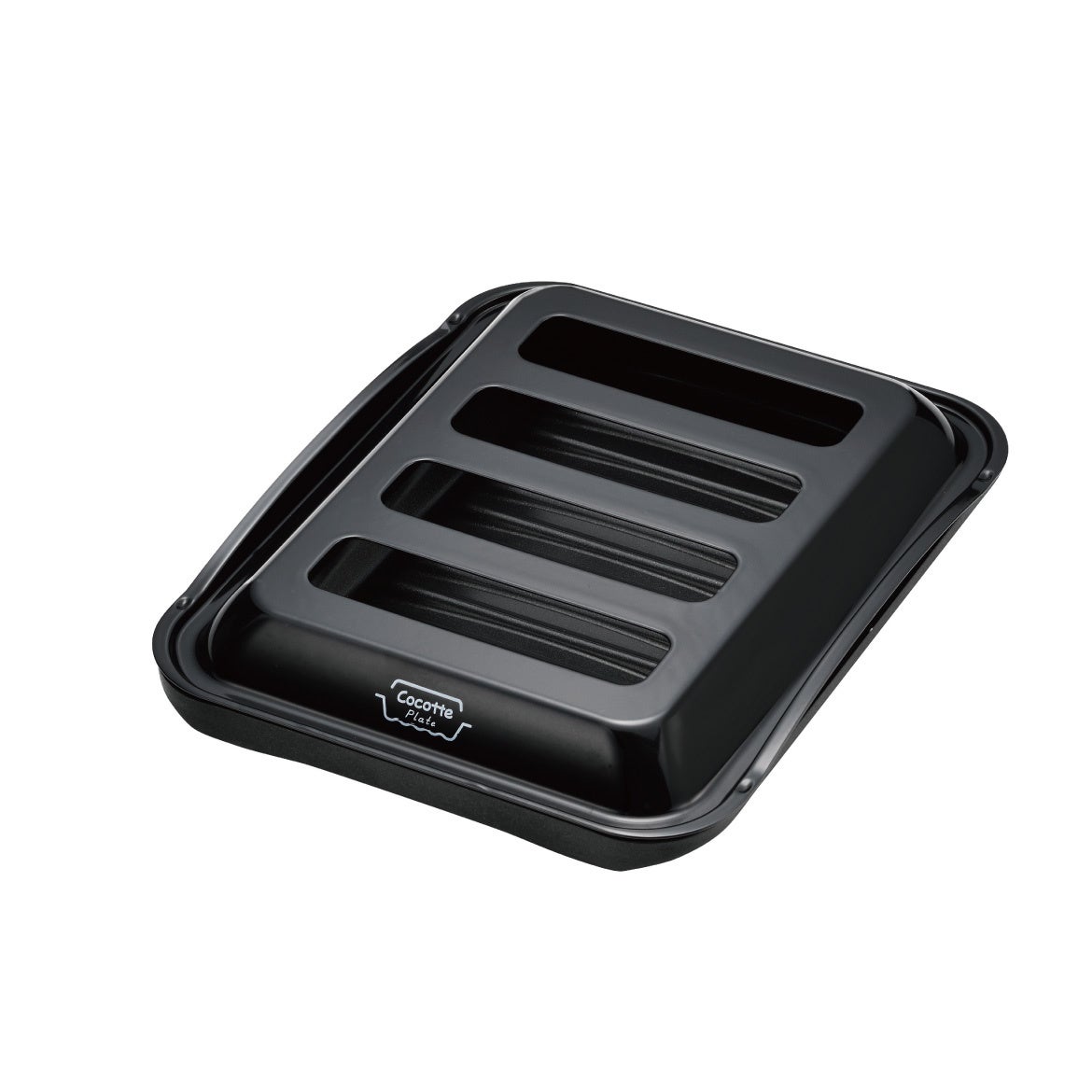 フタ部分のスリットから食材に直火が届く。ウェーブ形状のプレートが肉や魚の油を落とし、ヘルシーに。