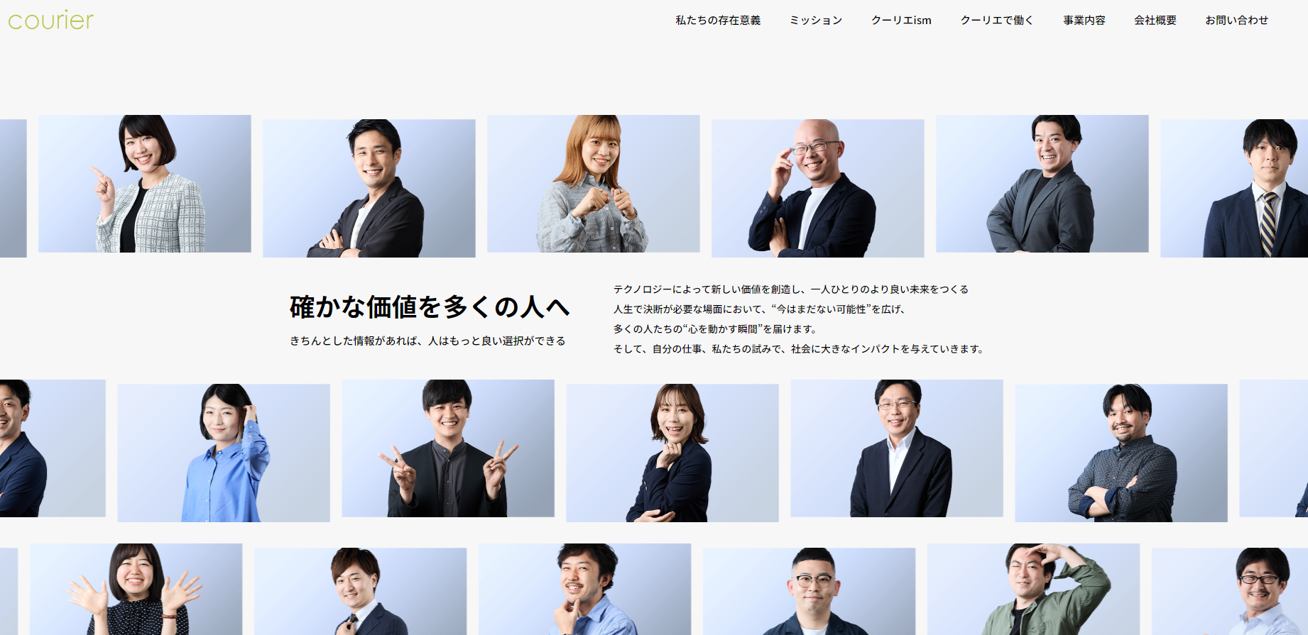 株式会社クーリエでは、「きちんとした情報があれば、⼈はもっと良い選択ができる」という考えのもと「確かな価値を多くの⼈へ」という企業理念を掲げ、デジタルプラットフォームビジネスを展開し、新たな価値創造を追求しています。
