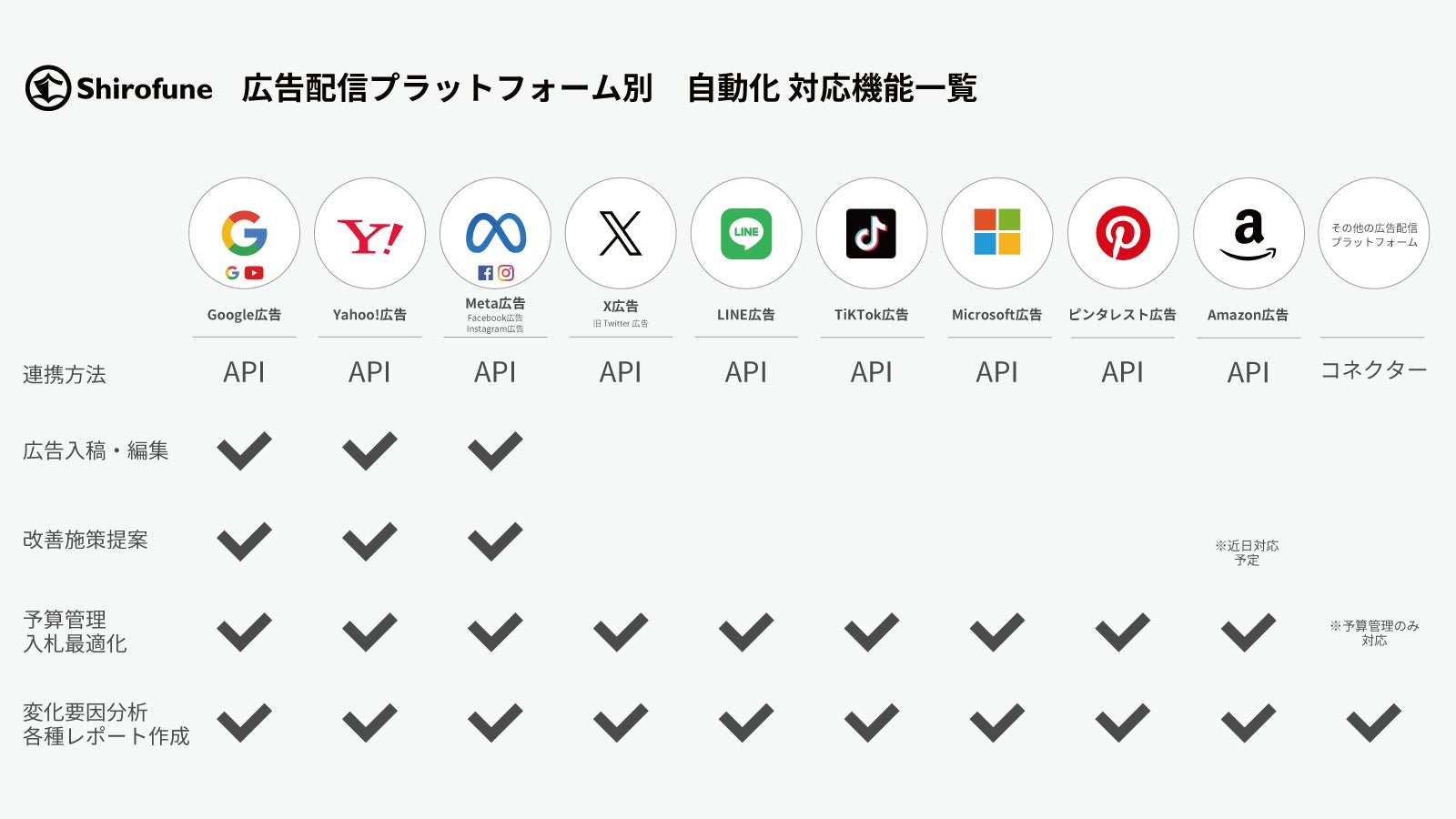 主要広告配信プラットフォーム10媒体目の対応となります。Amazon広告の運用だけでなく、他の広告とも横断した成果分析と、媒体ごとに配分を設定した予算の管理と入札最適化、レポート作成も可能なため、複数媒体の広告出稿でも、運用をまとめて効率化し、成果を改善する事ができます。