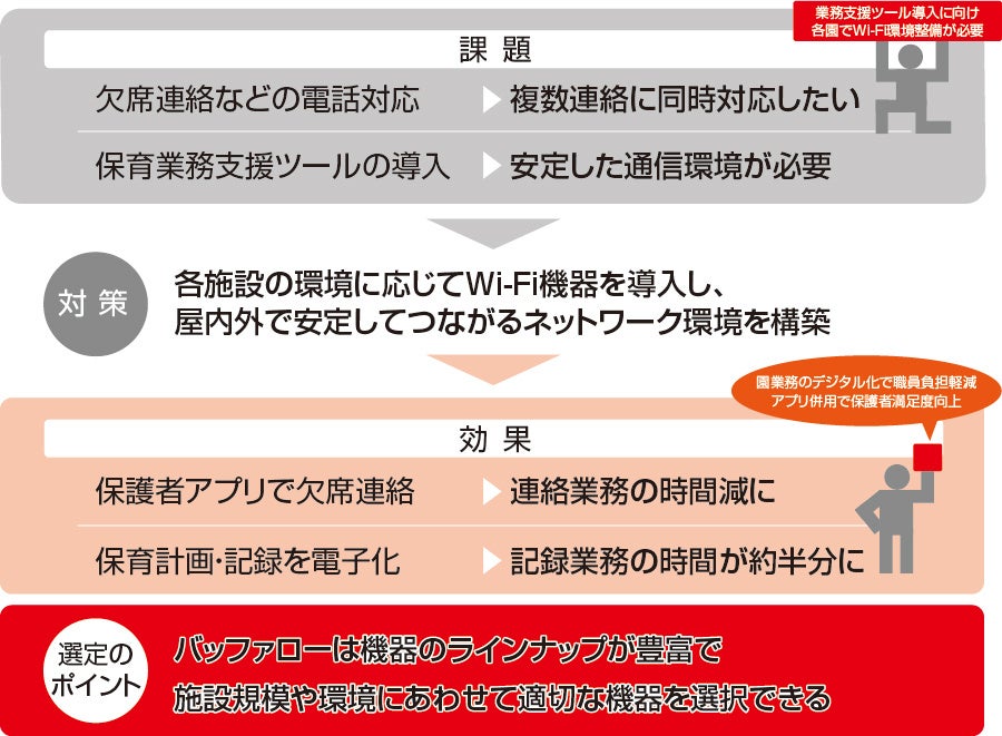 保育の質および保護者満足度向上を図るため保育園ICT化を推進。業務支援ツールの安定運用に向けて市内の保育園30園のWi-Fi環境を整備。