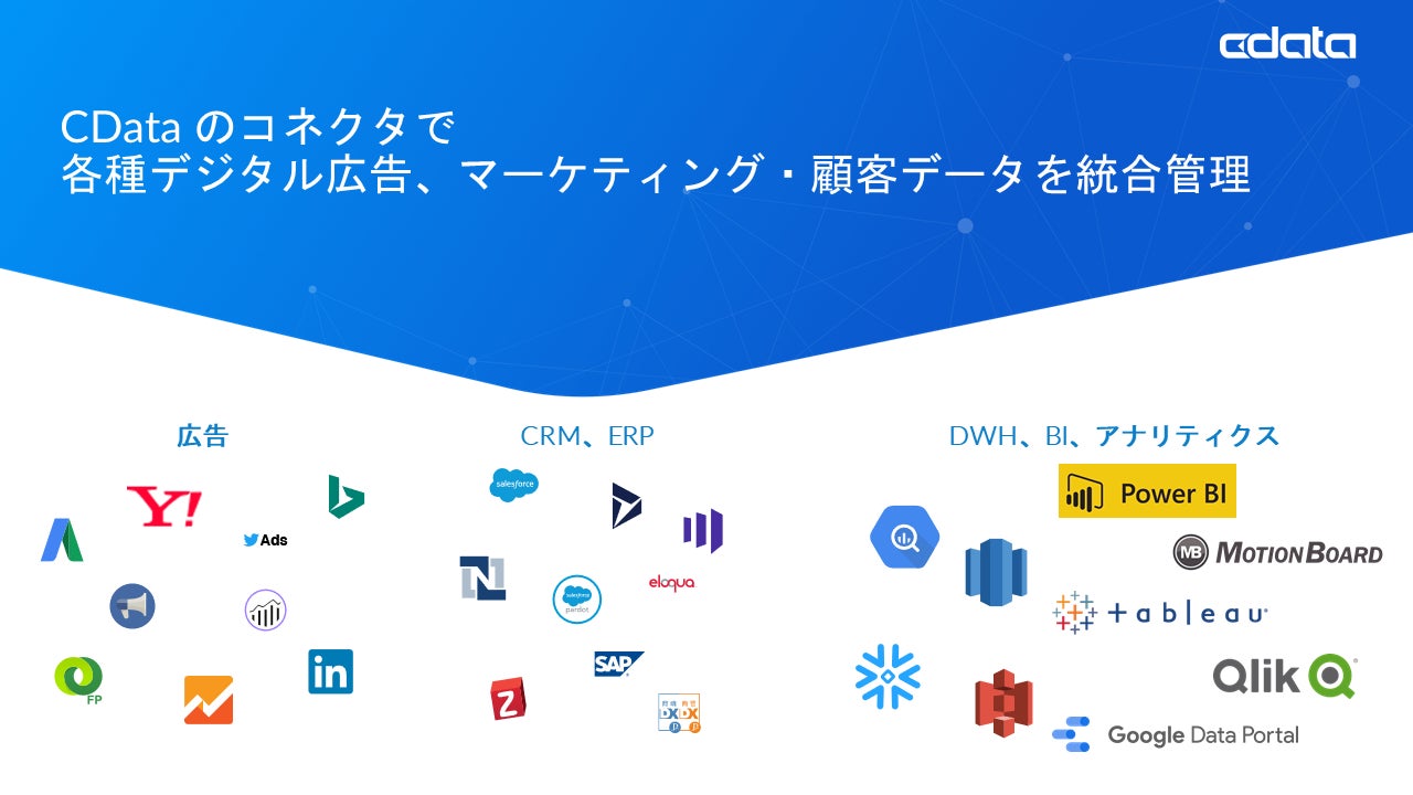 CData では、Google Ads、Facebook Ads、Twitter Ads、Google Ad Manager など多様なデジタル広告向けのコネクタを提供しています。複数のインターネット広告媒体にまたがるデータ分析や自動化を行うことができます。マーテック(Marketing &Tech)はデジタル広告にとどまらず、マーケティングオートメーションやCRM/SFA、メール配信、カスタマーサポートなどの顧客データを包括してCDP として利用するトレンドとなっています。CData の豊富なコネクタ群で企業に必要なマーケティング・顧客データを低コストで統合管理することが可能になります。